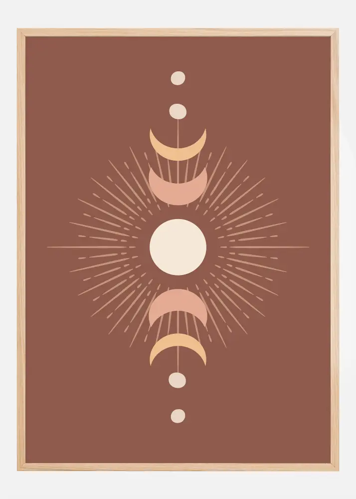 Ezt a stílusos posztert, amely a hold különböző fázisait ábrázolja egy mély és gondolatébresztő háttér előtt, kozmikus harmóniát és időtlen szépséget sugároz. Az óvatosan megrajzolt holdfázisok, központilag elhelyezve az alattuk sugárzó nappal, emlékeztetnek arra, hogy hol helyezkedünk el az univerzum tágabb összefüggésében. Meleg, föld tónusokban gazdag színvilága nyugtató és barátságos légkört teremt.
