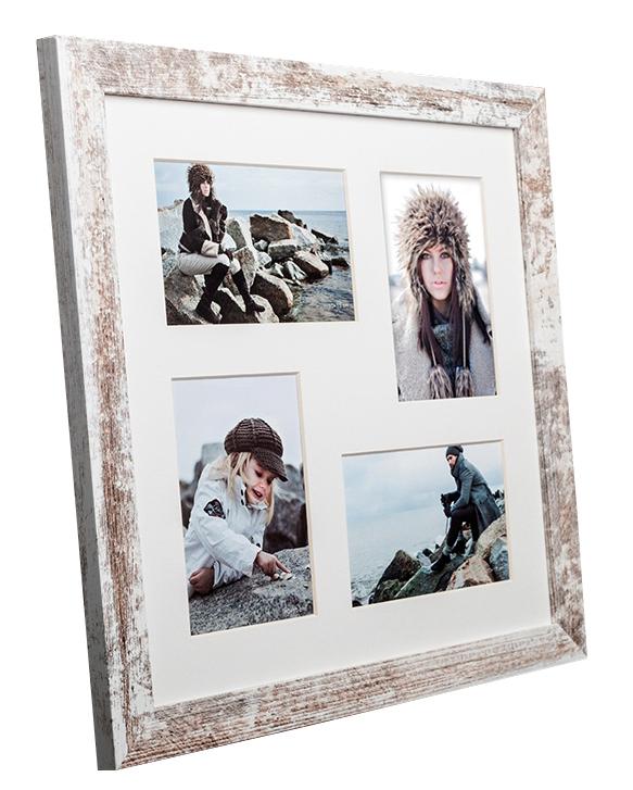 Stílusos vintage keret széles keretprofillal, elhasználódott fehér és fa megjelenésben. Extra dimenziót ad a képeidnek és tökéletesen illik, ha valódi vintage érzést szeretnél. Kollázs keret 4 darab 10x15 cm-es kép számára biztosít helyet.