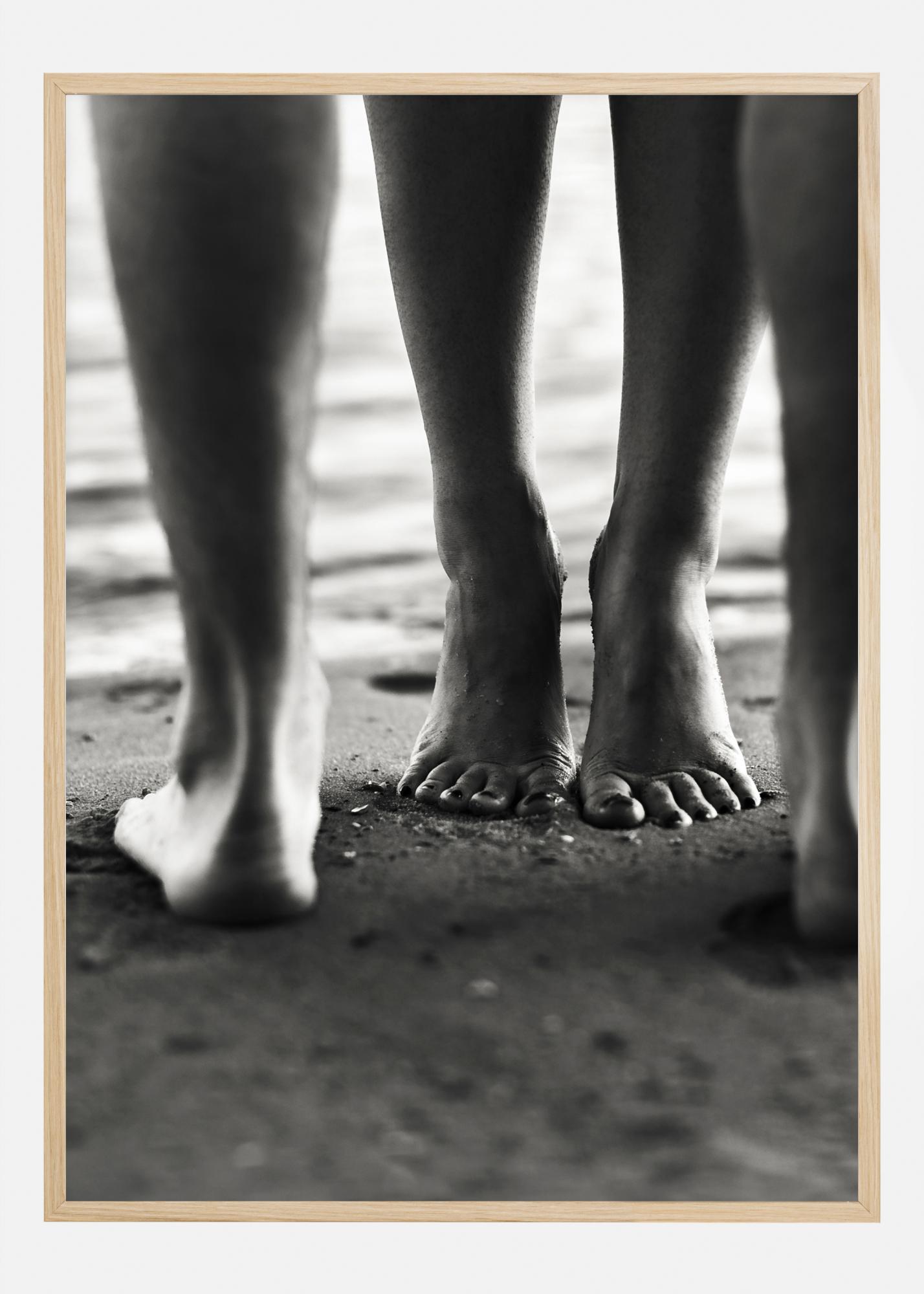Egy romantikus poszter fekete-fehér közelképe négy lábnak a tengerparton. A kép két egymás felé néző személyt ábrázol. A tekintet könnyen megakad a lábujjhegyen álló alakra. Ez a gyönyörű nyomat romantikus érzést kölcsönöz, és ideális a hálószobába, amikor egy kis romantikára vágyik.