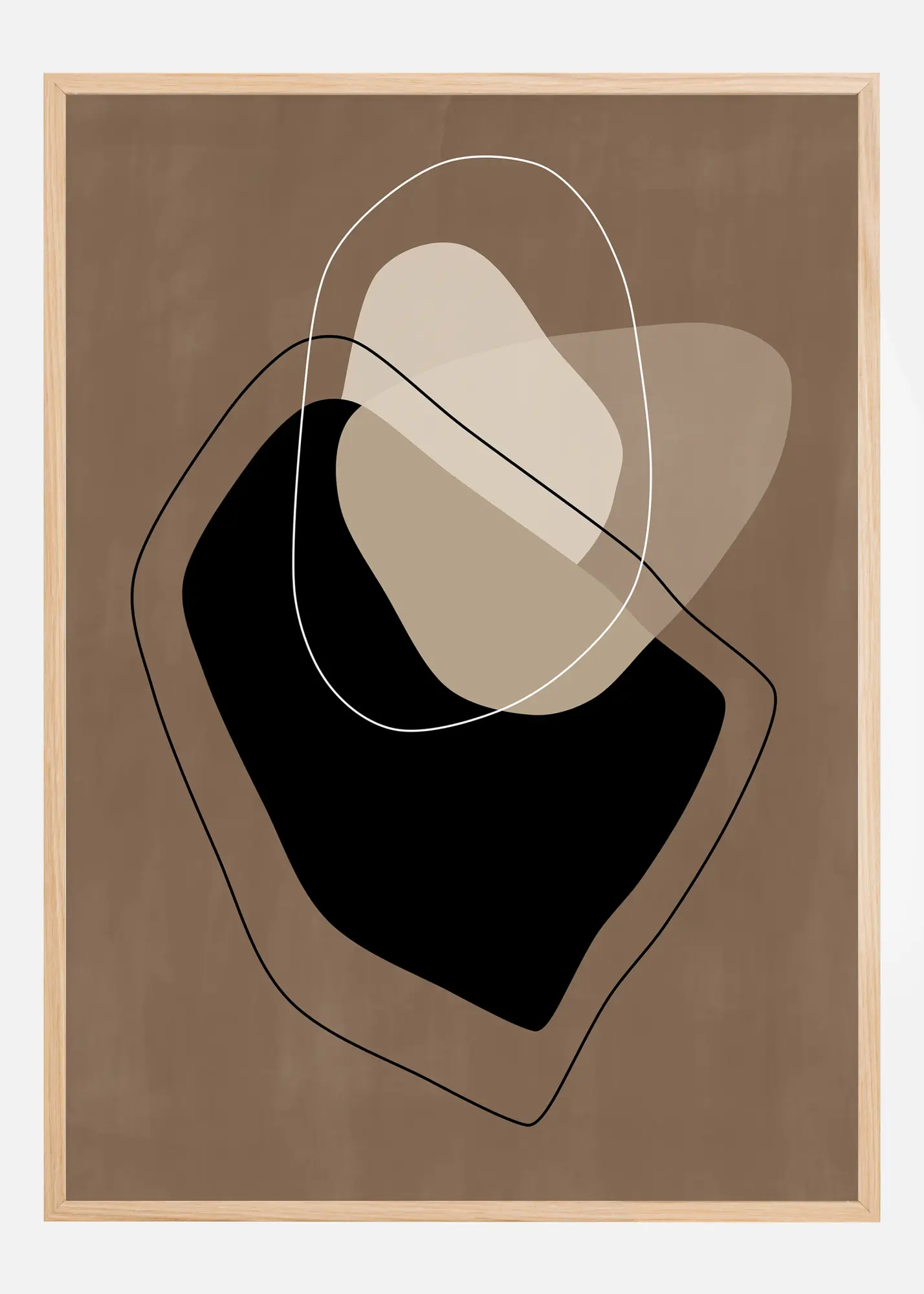 Ez a poszter egyesíti a geometrikus absztrakció esztétikai tisztaságát egy meleg és barátságos színpalettával. Egy kreatív együttműködést mutat be sötét és világos árnyalatok között, ahol merész fekete formák kontrasztálnak puha fehér vonalakkal és bézs, valamint taupe színű mezőkkel. Ez az elemek konstellációját egy vékony, fehér keret zárja körül, amely tér és mélység illúzióját kelti. Ez a poszter tökéletes annak, aki értékeli a modern dizájnt, és olyan műalkotást keres, amely a kontrasztos színeket és formákat gondolatébresztő és esztétikus módon olvasztja össze.
