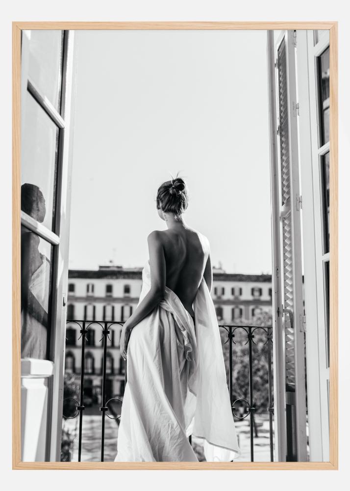 Egy szexi fekete-fehér közeli poszter egy nőről, aki egy erkélyen áll egy fehér törölközőben. A haját kontyba kötve úgy tűnik, hogy a nő csodálja a kilátást. A nőnek az ablakban visszatükröződő képe érzéki benyomást kelt. Ez egy érzéki és gyönyörű kép, amelyet a hálószoba falára lehet akasztani.
