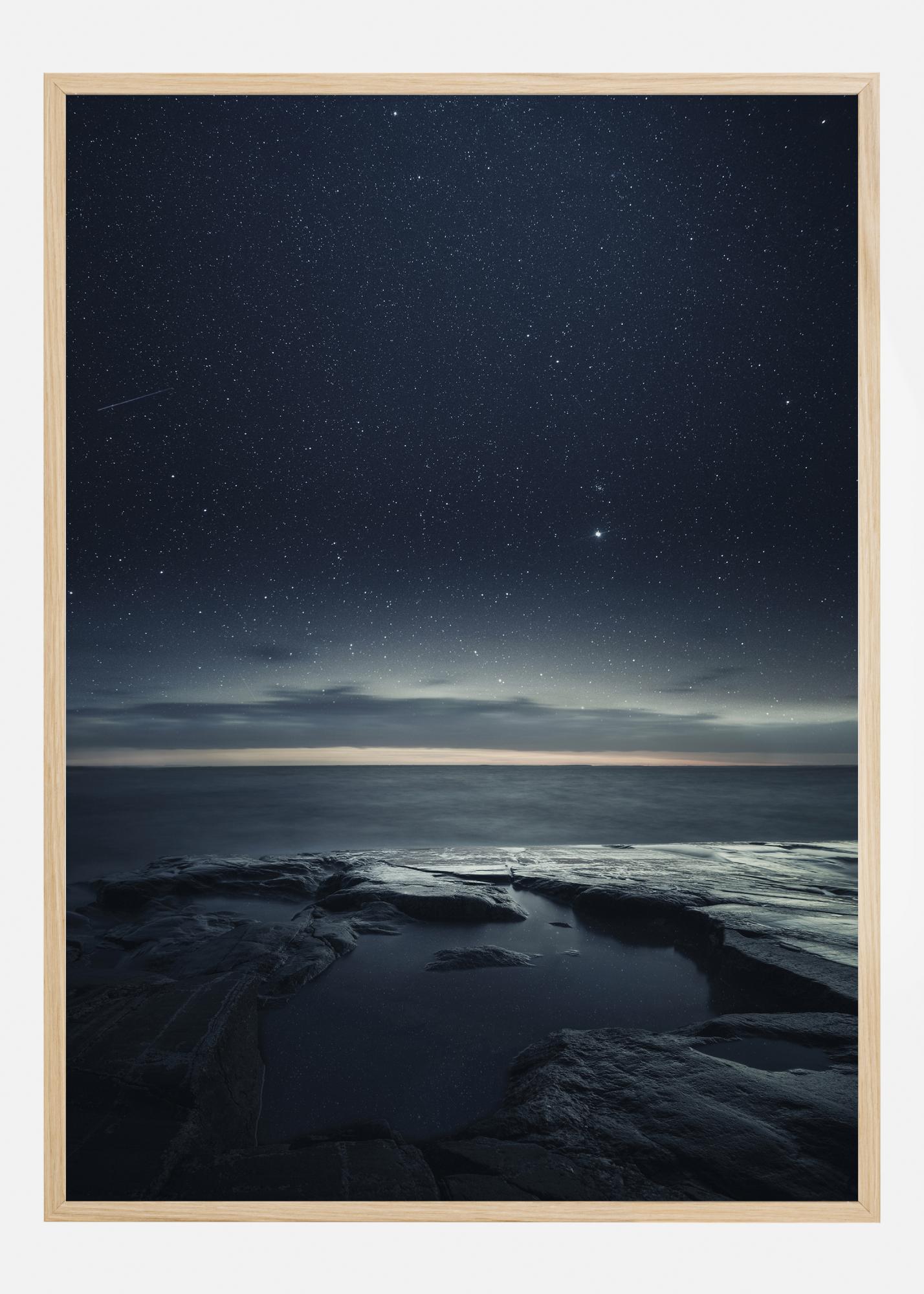 Egy fantasztikus nyomat egy sziklás strandról, ahol a víz visszatükrözi a tiszta, lila eget csillogó csillagokkal. A horizont jól látható a tenger fölött húzódó fehér fénycsíknak köszönhetően. Ez egy ritka poszter, amely esti varázst hoz otthonába.