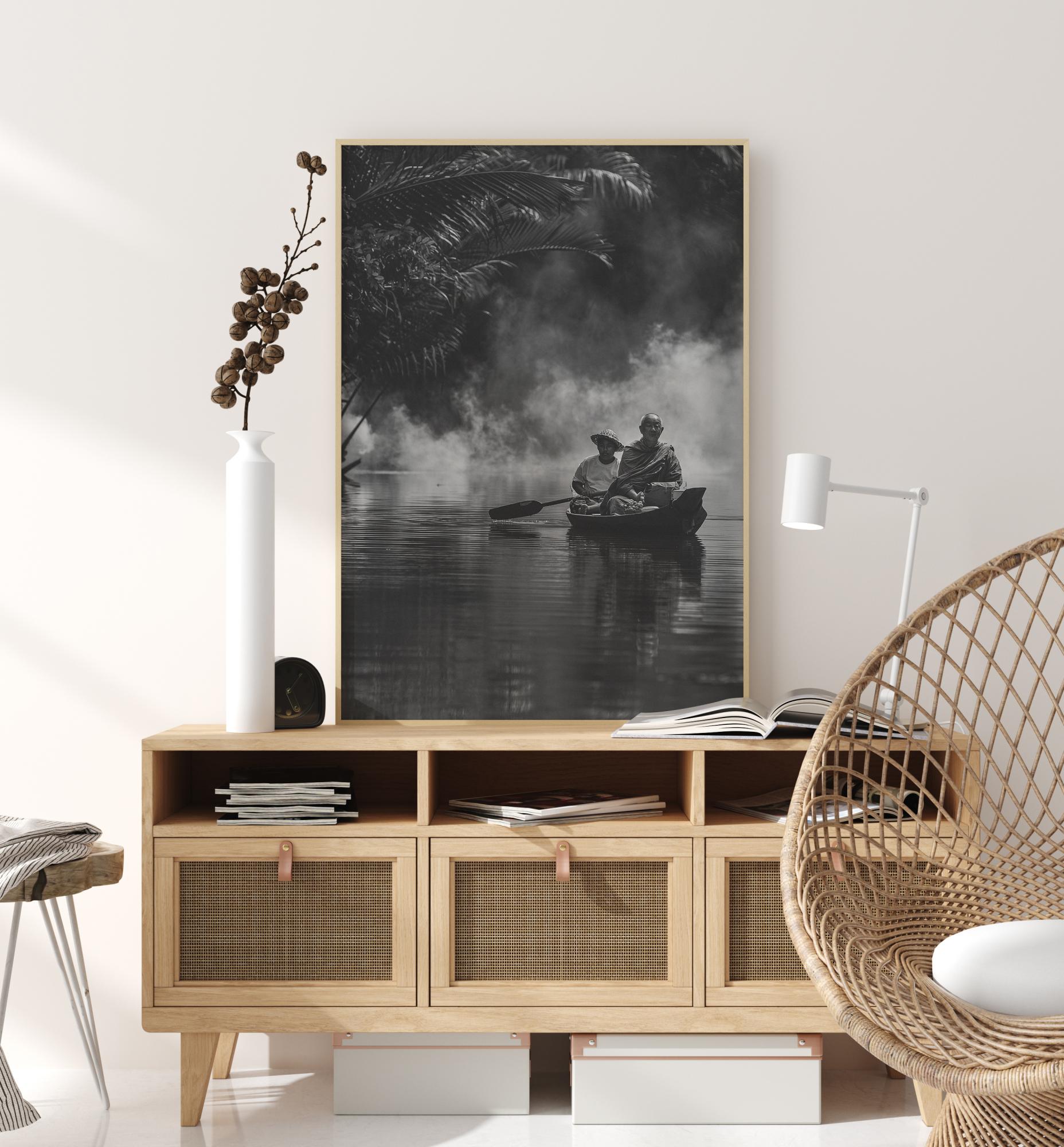 Egy békés fekete-fehér közeli fotó két férfiról, akik egy folyón utaznak. Két férfi békésen ül a thai gondolahajójukon, és úgy tűnik, mintha megfigyelnék a környezetüket. A felhőkön átsütő természetes napfény visszatükrözi a hajót a vízen. Szinte hallani lehet a csendet ezen a poszteren. Tökéletes egy nyugodt környezethez.