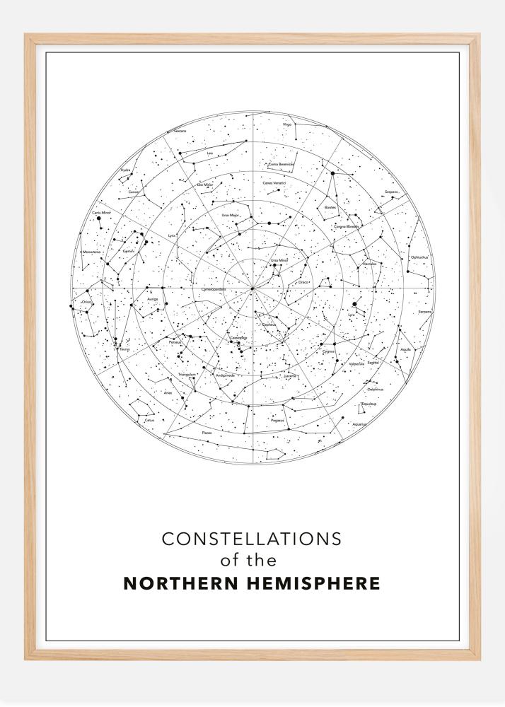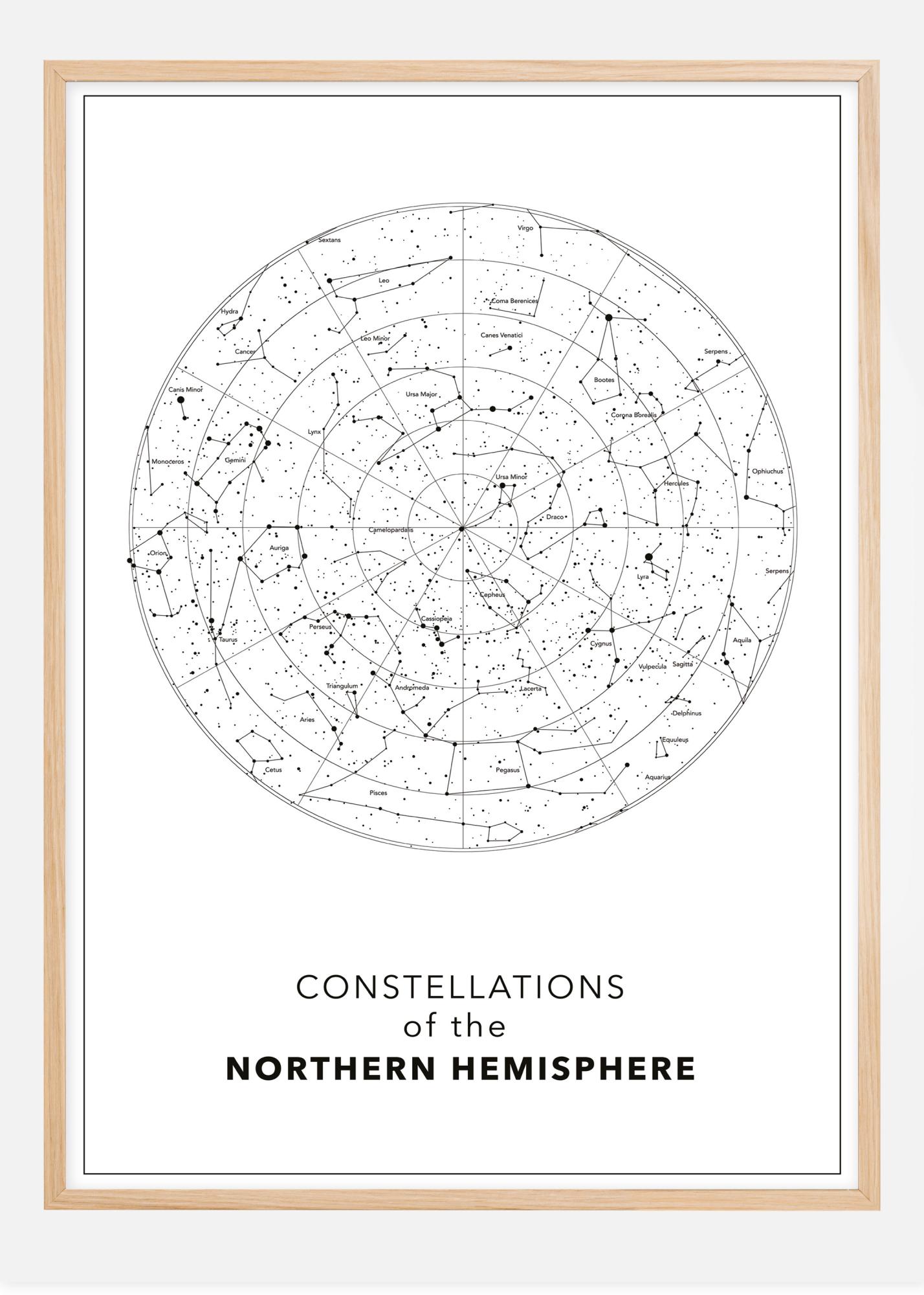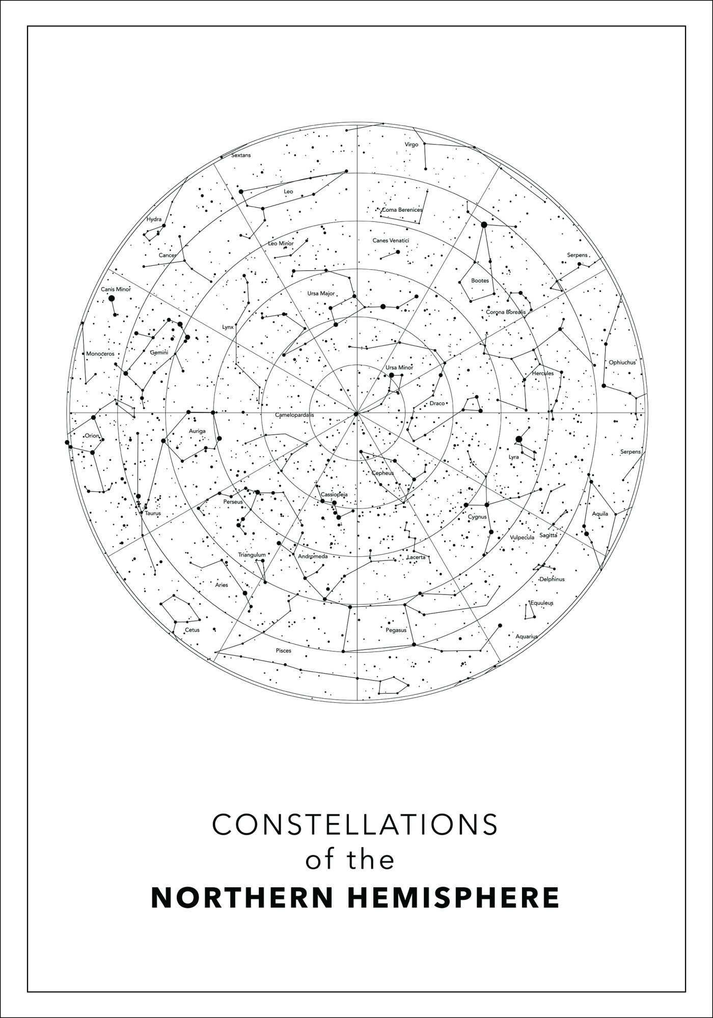 Egy elbűvölő kör alakú térkép az északi csillagos ég csillagképeiről. Fehér háttéren a hosszúságok és szélességek feketével vannak felvázolva, minden csillagkép neve alatt megírva. Ez az elbűvölő nyomat tökéletes egy könyvtárhoz vagy egy privát olvasószobához.