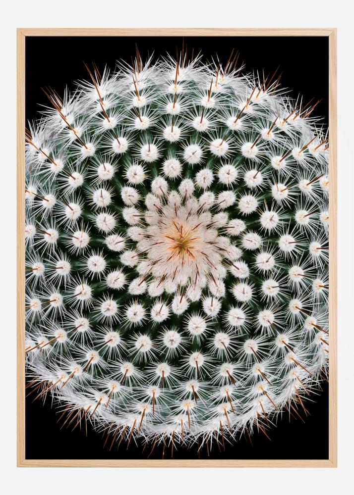 Egy légifelvétel egy kaktuszról fehér virágokkal. Fekete háttéren a sötétzöld szín kiemeli a fehér virágokat és a hegyes tüskéket. A növény központi részének enyhe sárga árnyalata extra színt ad a nyomatnak. Tökéletes poszter mindenkinek, aki szereti a növényeket.