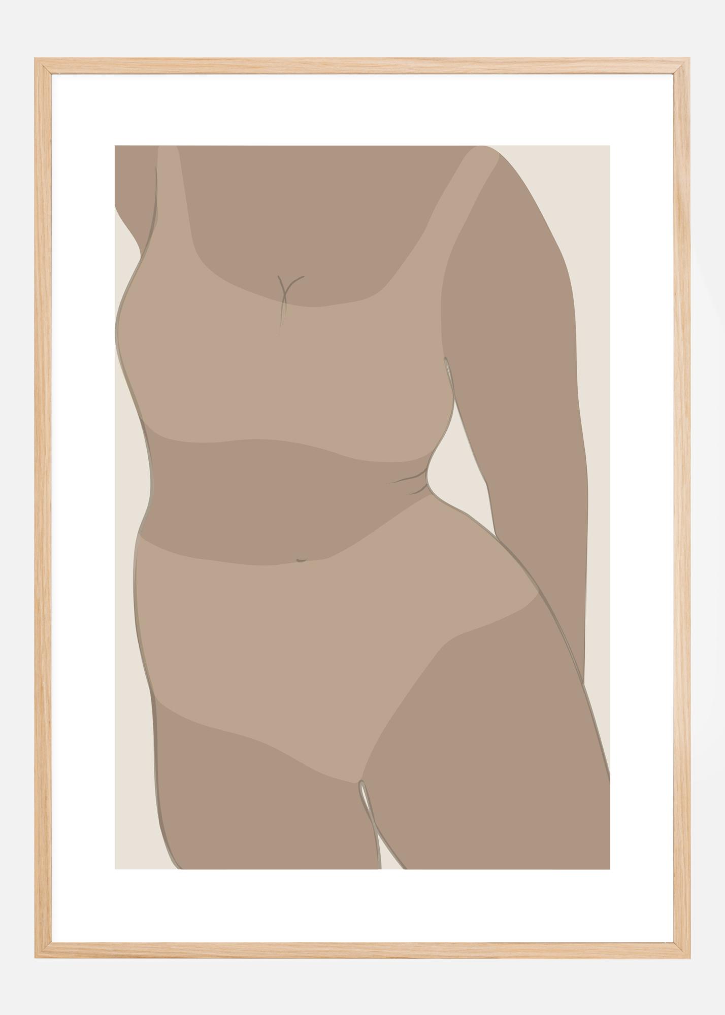 Egy bézsszínű poszter egy nőről, aki fehérneműben van. Világosbézs háttér előtt láthatók a világosbarna, formás combok, és egy kis hasadék választja el a melleket egymástól. Egy egyszerű nyomat, amely megmutatja a fehérneműs nő szépségét. Csodáld meg ennek a nőnek a szépségét.