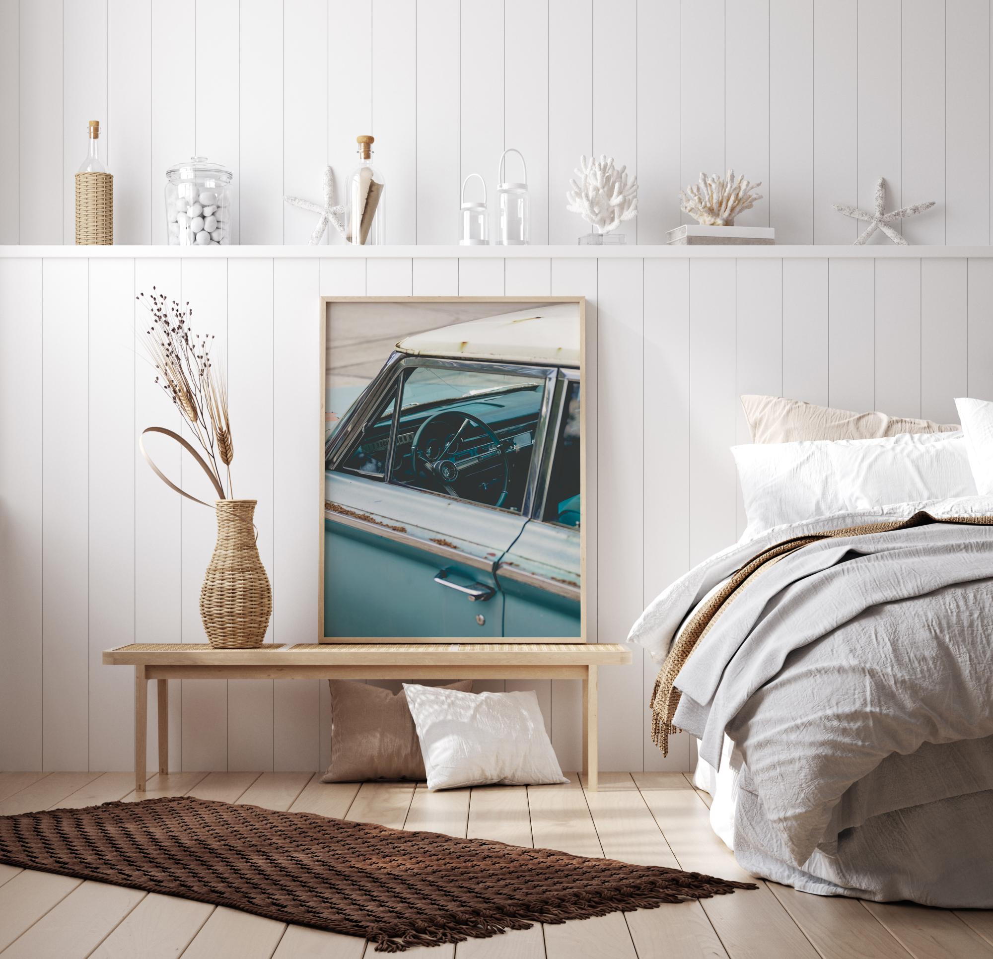 Egy fantasztikus közeli kép plakát, amely egy rozsdás régi autót ábrázol vintage kormánnyal és sebességmérővel. A világoskék autómodell visszavisz minket az 1950-es évek legmenőbb autómodelljeihez. Tökéletes nyomat, amelyet egy vintage stílusú környezetben lehet felakasztani.