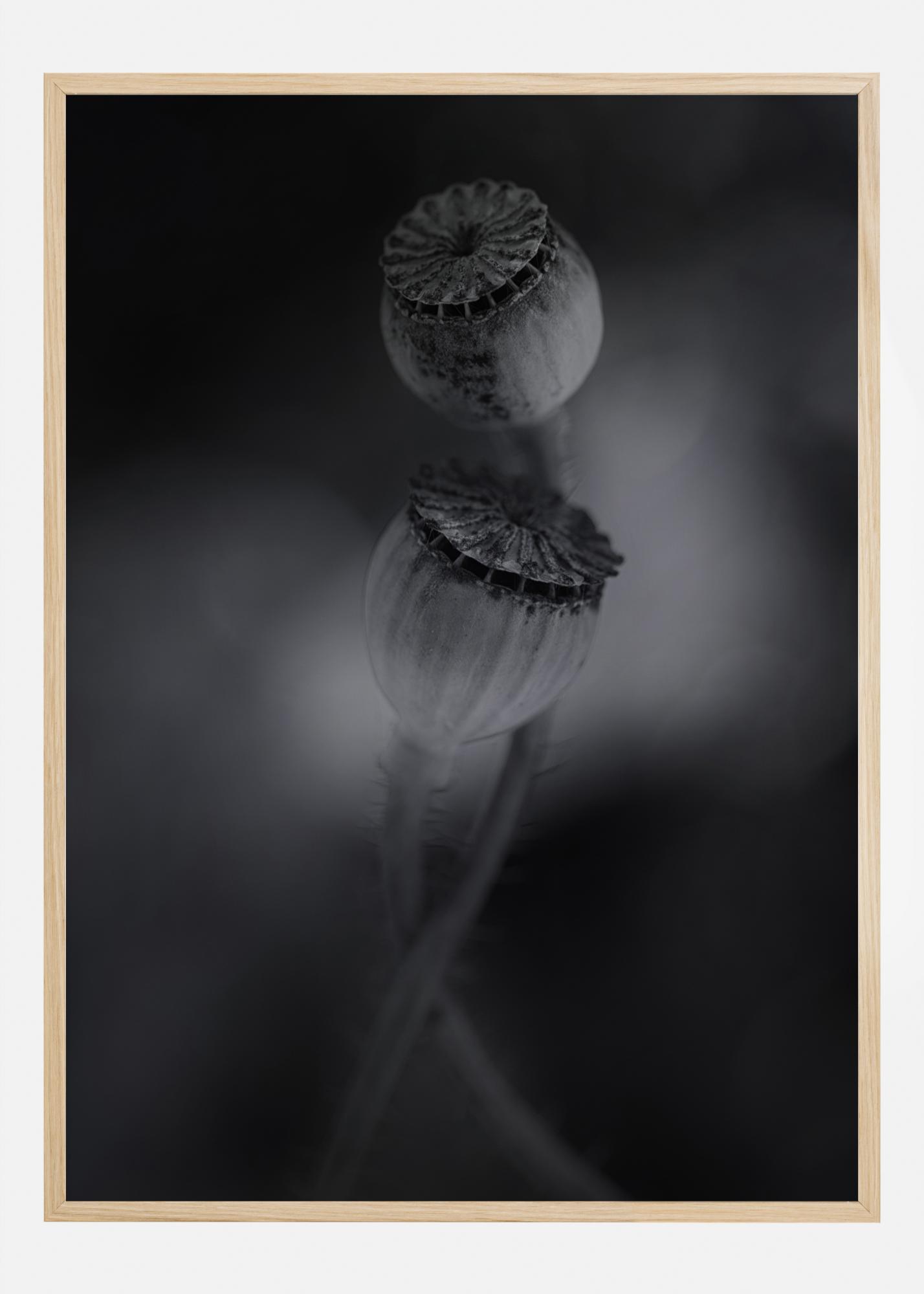 Hihetetlen fekete-fehér közeli poszter két elnyílt pipacsvirágról. A két magkapszula összefonódik, miközben a természetes fény elmosódott fekete hátteret hoz létre. Ugyanakkor a fény kiemeli a növények szépségét. Adj egy csipetnyi nyugalmat otthonodnak ezzel a nyomattal.