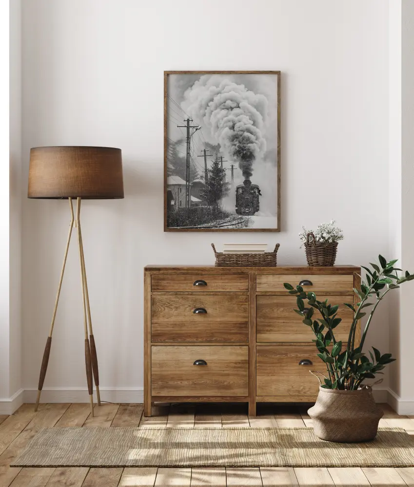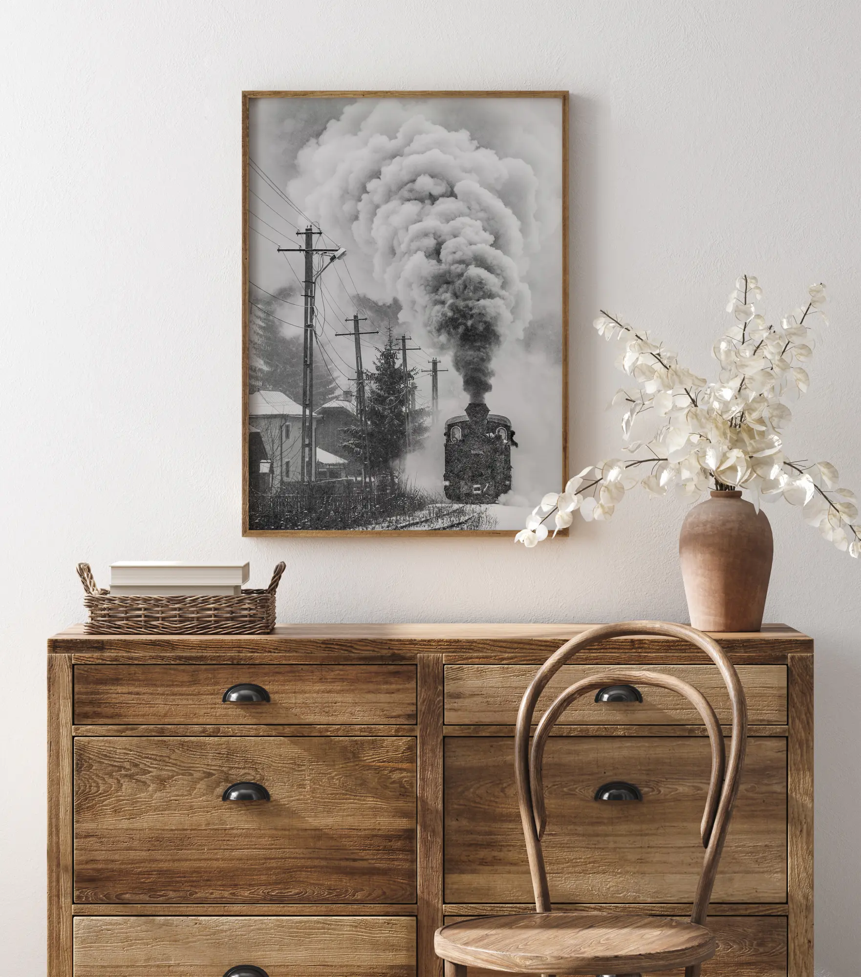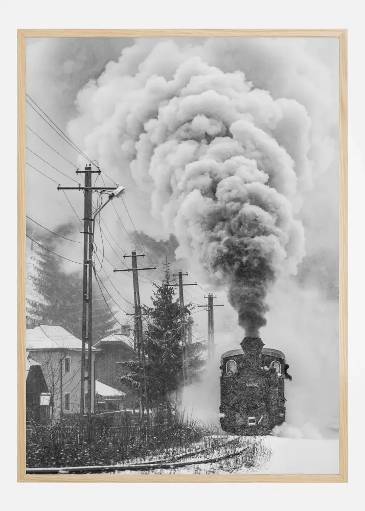 Egy drámai poszter egy gőzmozdonyról hóban. Engedd, hogy magával ragadjon a kép epikája, amint a füst magasra száll. Varázsolj karácsonyi hangulatot, amikor ezt a posztert felakasztod a falra.