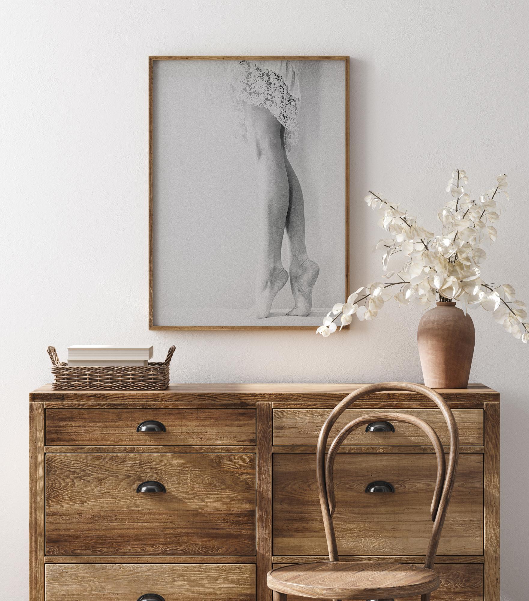 Egy elegáns félprofil egy nő portréjáról, aki lábujjhegyen áll. A kép egyszerűsége a finom fehér árnyalattal kombinálva kiváló kiegészítője lehet a hálószobádnak vagy a nappalidnak.
