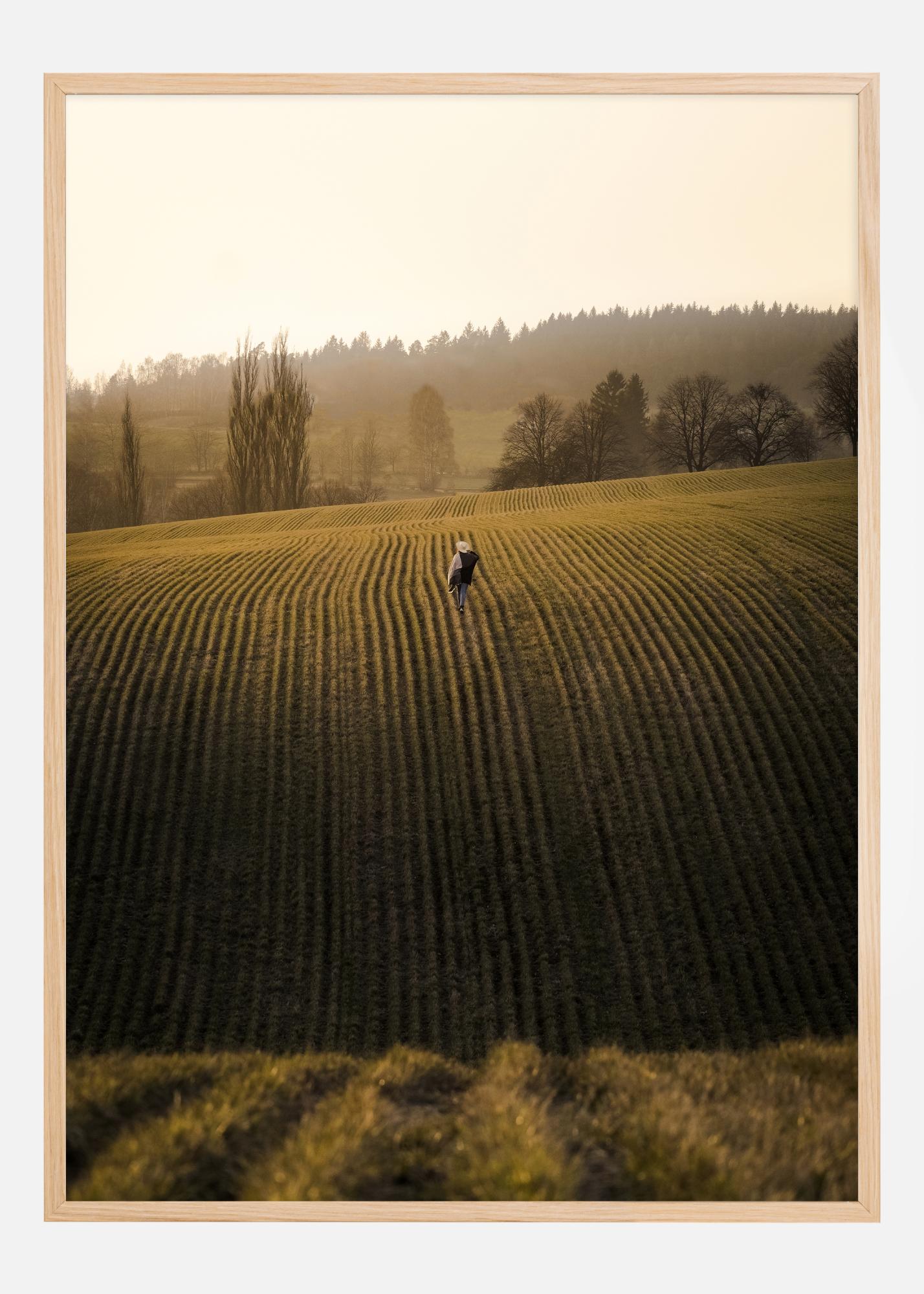 Ez a poszter megragadja a vidéki idill lényegét a nyugalom és egyszerűség pillanatában. Egy magányos alak sétál a megművelt mező szimmetrikus sorai mentén, beleolvadva a naplemente meleg fényébe, amely arany órát teremt a tájat megvilágítva. Ez a kép meditációt kínál az élet ritmusáról és a természet változó szépségéről, és arra invitálja a szemlélőt, hogy kövesse őt egy csendes sétán a mezőn keresztül.