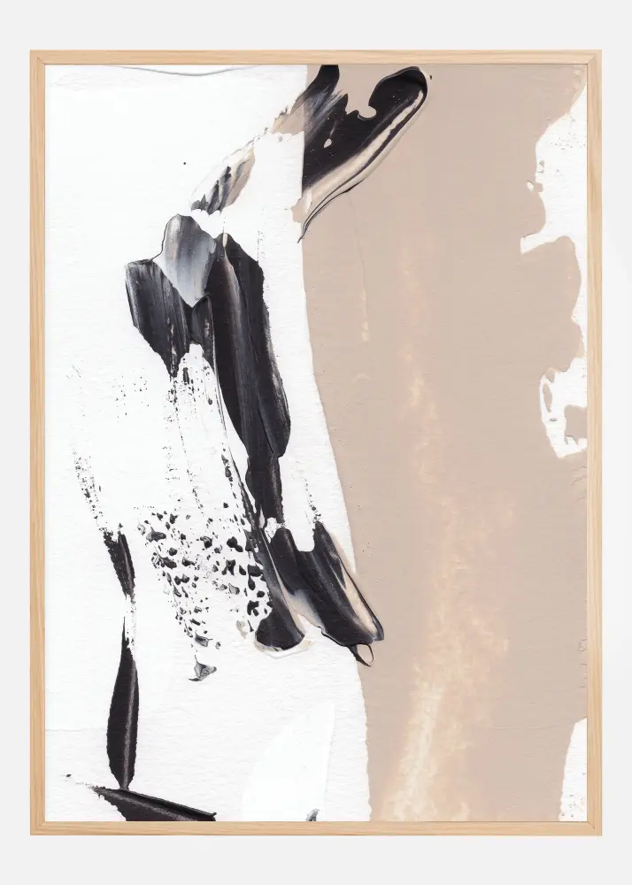 Ez a merész és kifejező poszter az absztrakt művészet ünnepe és annak képessége, hogy érzelmeket és értelmezéseket keltsen életre. A krémes háttér előtt a fekete és szürke ecsetvonások dinamikus kompozíciója a mozgást és a kreativitás mulandó természetét illusztrálja. A szétszórt fröccsenések és cseppek organikus érzést adnak hozzá, és minden vonalban és formában megmutatják a művész kezét.