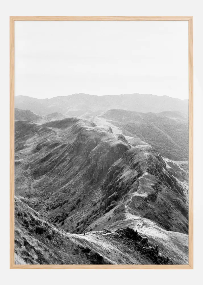 Egy fekete-fehér poszter egy hegylánccal. A különböző szürkeárnyalatok tökéletesen beleolvadnak egymásba. Növényzet vagy élet jele nélkül szinte hallható a csend a hegycsúcsokon. Akaszd fel ezt a nyomatot egy színes falra, és hallgasd a szelet, ami fúj.