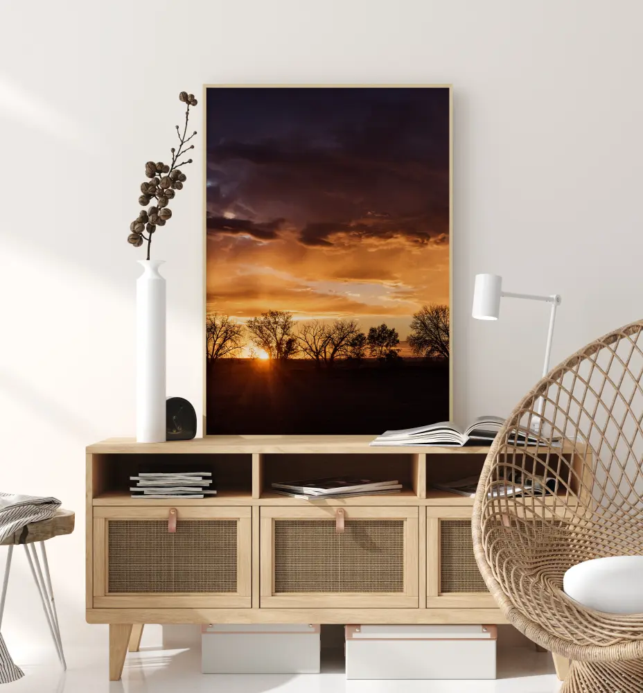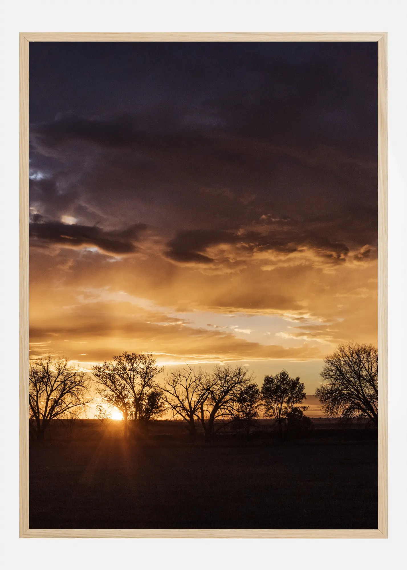Egy lélegzetelállító nyomat egy narancssárga naplementéről. A naplemente a horizonton kiemeli az őszi fákat a mezőkön. A látványos égbolt narancssárga árnyalatai meleg és megnyugtató hangulatot teremtenek. Egy fantasztikus poszter, amely meleget hoz a nappalijába.