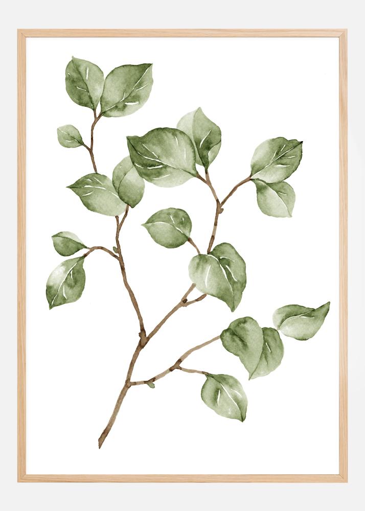 Egy gyönyörű poszter egy vékony barna ággal, kis zöld levelekkel. Fehér felületre festve a lágy barna és zöld színek kiemelik a levelek finom fehér ereit. Egy szép nyomat, amelyet világoszöld falra lehet akasztani.