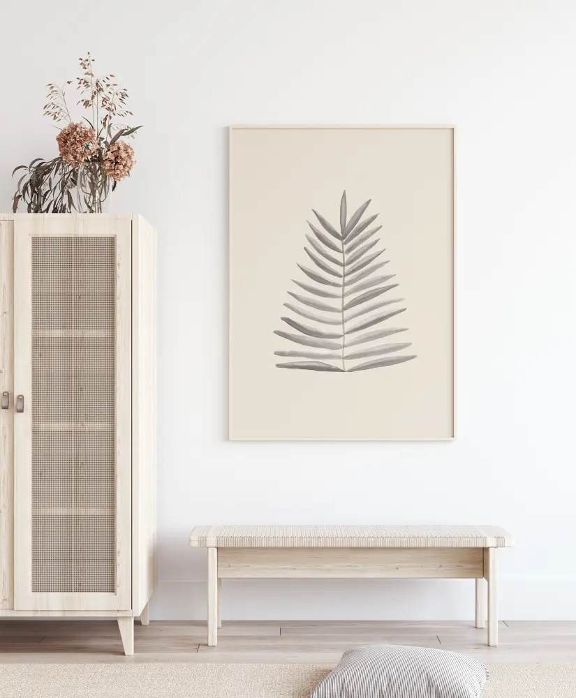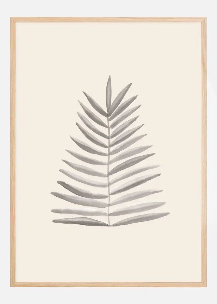 Egy egyszerű, mégis feltűnő poszter egy pálmalevéllel. Krémfehér háttérre rajzolva, a levél egyenesen áll a szárán. A krémfehér háttér kiemeli a kis barna pálmalevelet. Tegye ezt a klasszikus érintést egy színes falra.