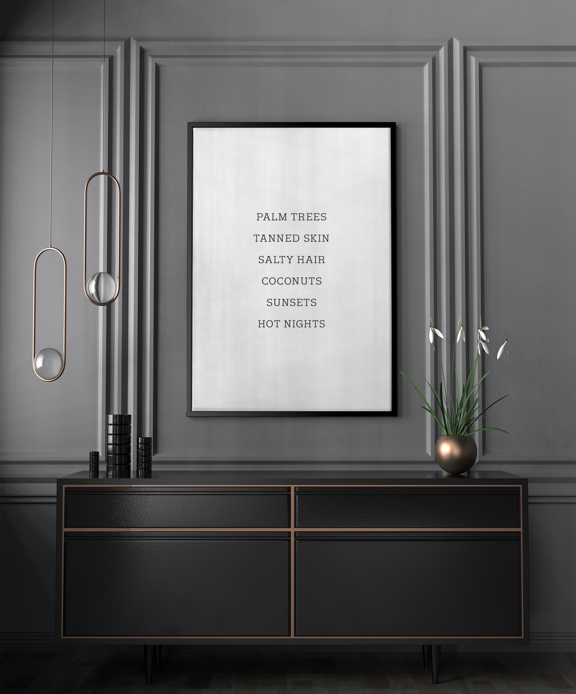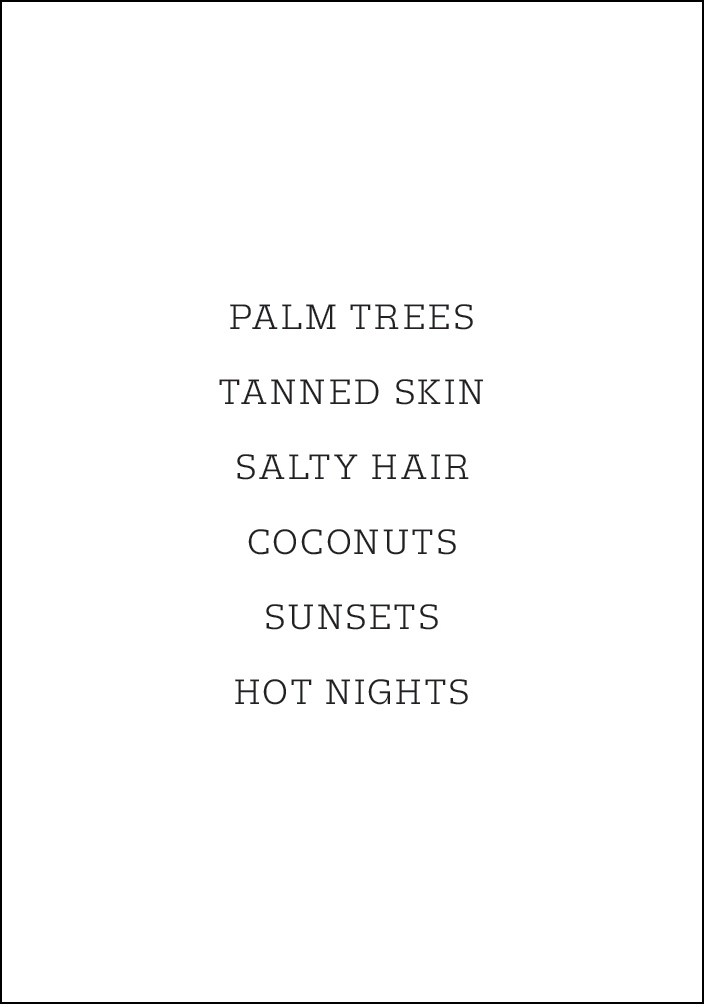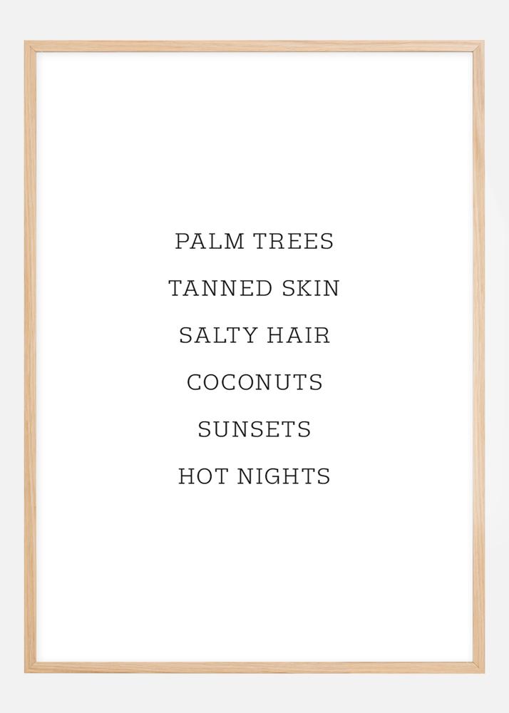 Egy passzív plakát, amely nyári érzést közvetít. A fekete betűtípus a fehér felületen a következő szavakat tartalmazza: PÁLMÁK, NAPBARNÍTOTT BŐR, SÓS HAJ, KÓKUSZDIOK, NAPLEMENTÉK, MELEG ÉJSZAKÁK. A központilag elhelyezett szavak emlékeztetnek minket a nyári szezonra. Adj egy kis nyári hangulatot a modern nappalidhoz ezzel a nyomattal.