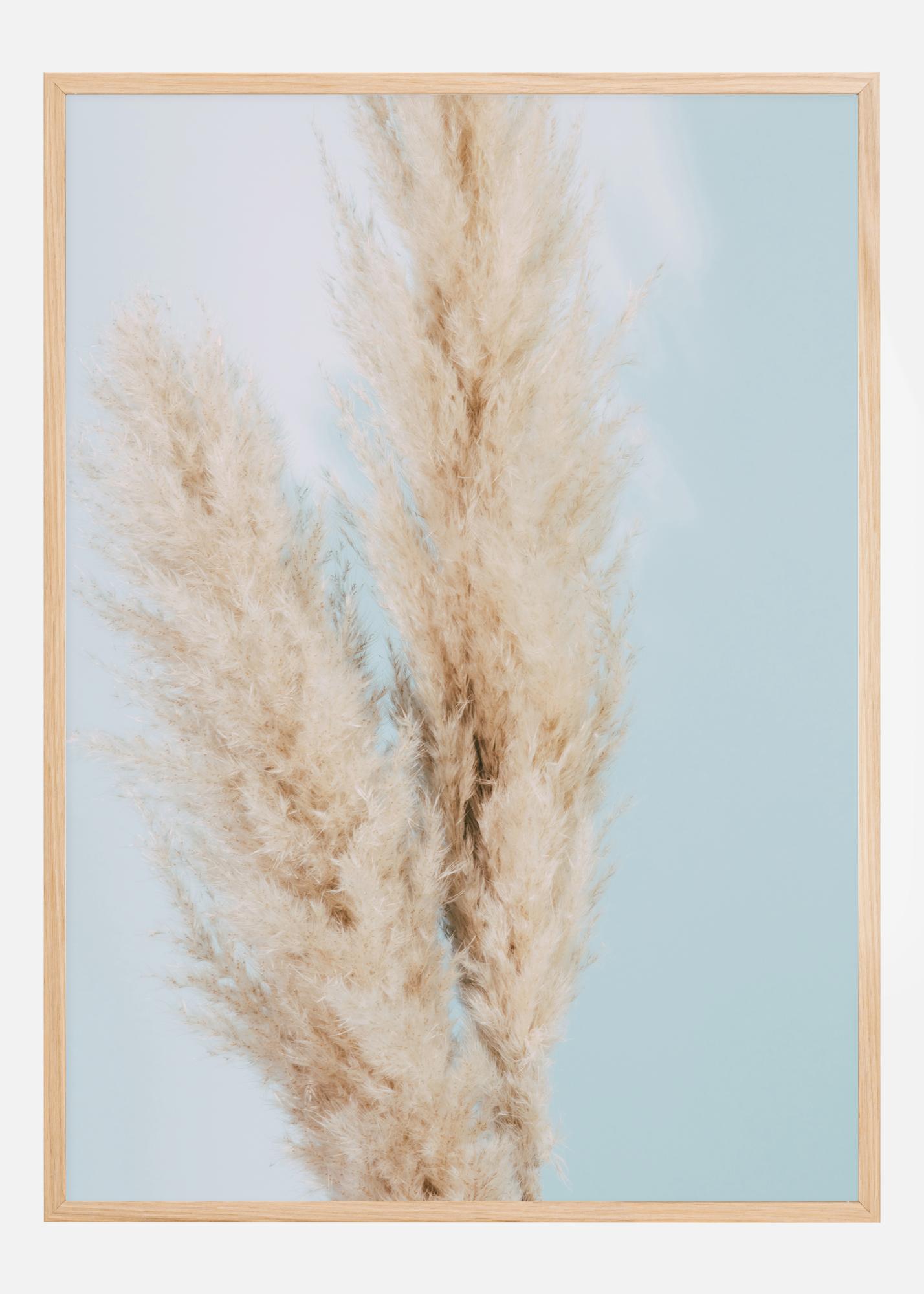 Egy poszter ragyogó pampafűvel a tiszta kék ég alatt. Az ezüstfehér takarók merész kontrasztot alkotnak a világoskék éggel. Majdnem érezni lehet a tollak puhaságát, amikor a kép a hálószobádban lóg.