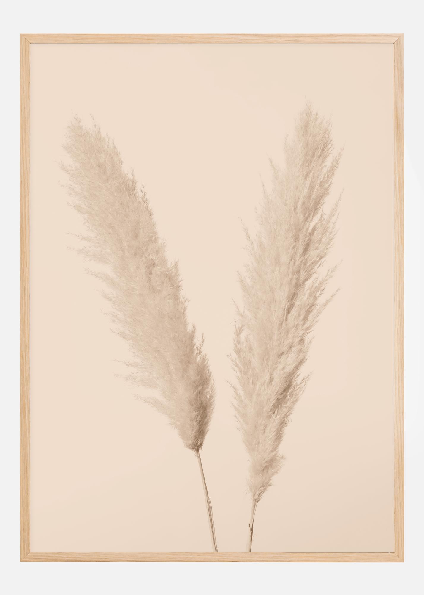 Közeli kép két pampafű fejéről. A kép tompa pasztell színei és rózsaszín árnyalatai valóban kiemelik a fű bolyhos szárát. Majdnem érezheti, ahogy a nyugalom hullámokban árad, miközben ezt a posztert nézi.