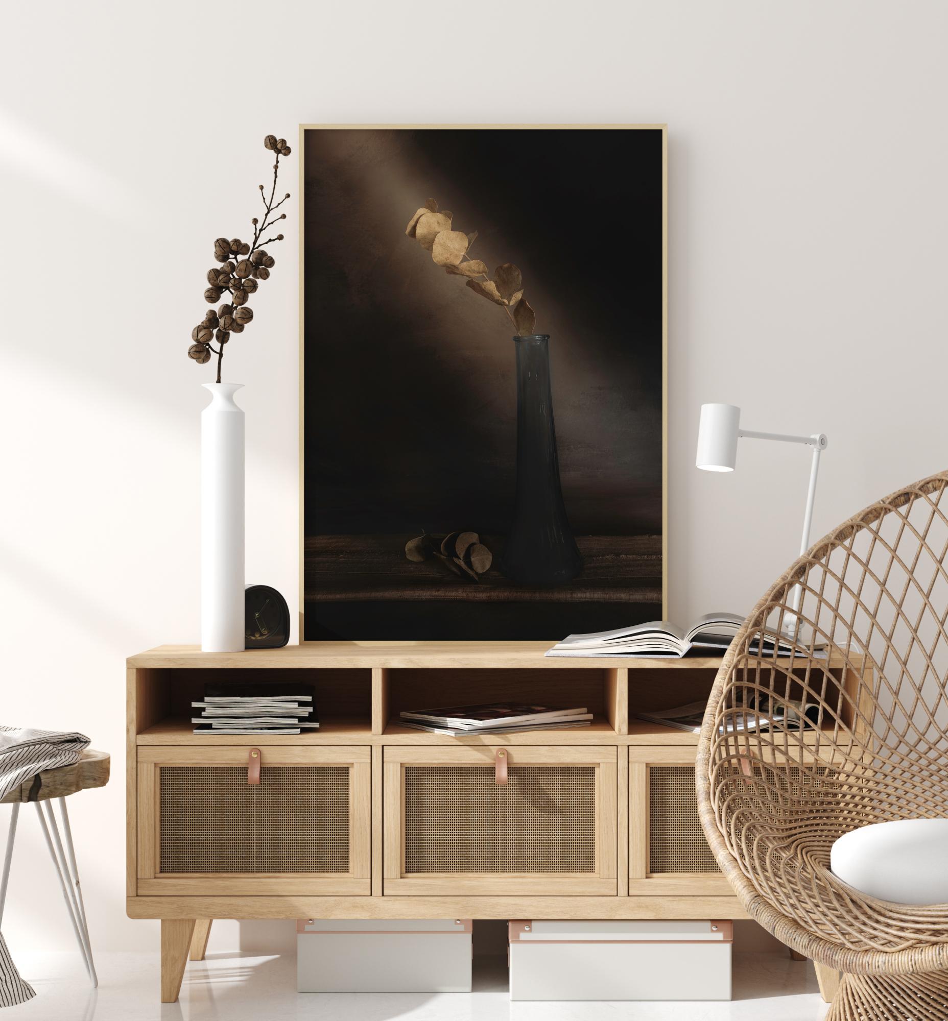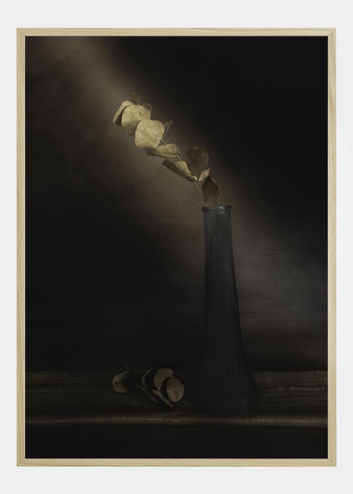 Egy egyszerű, de gyönyörű nyomat egy üveg vázában lévő szárított levelekkel díszített szárról. Világosbarna háttér előtt a természetes fény közvetlenül a szárított fűre vetül. A kép alján egy levélgyűjtemény található, amely lehullott a szárról. Egy csodálatos poszter, amely békés környezetben függeszthető fel.