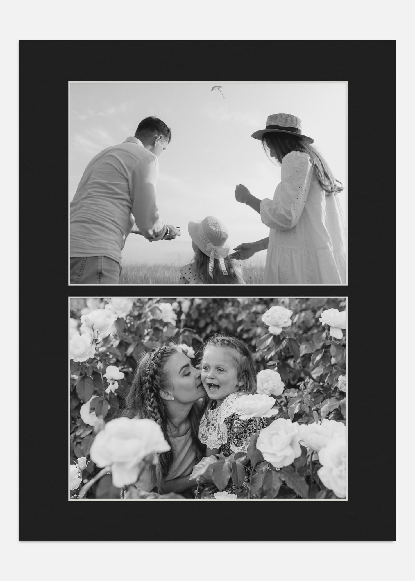 Savmentes fekete kollázs passepartout ferde vágású fehér szélekkel, a legmagasabb minőségben. A passepartoutban van hely 2 kép számára. Tökéletes, ha saját fotókollázst szeretnél készíteni.