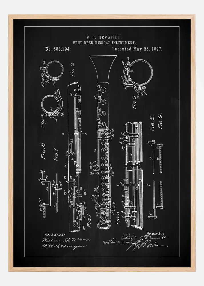 Ismerje meg ezt a fenséges szabadalmi posztert, mely a zenei innováció és dizájn tisztelgése. Ez a poszter P.J. DeVault klarinétját ábrázolja, egy 1897. május 25-én kiadott szabadalmat, amelynek száma 583,194. Az eredeti szabadalmi rajz pontos másolata szemlélteti az eszköz összetett mechanikáját és szépségét, tökéletes kiegészítés minden olyan helyiségbe, ahol a zenét és a történelmet értékelik.