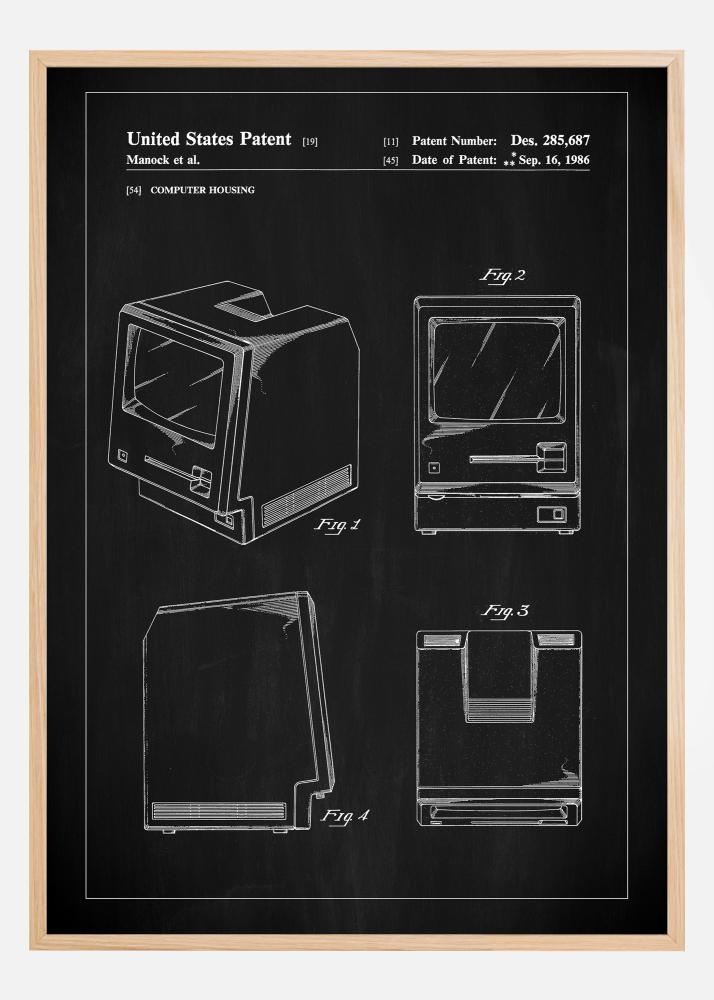 Ez a szabadalomposzter egy Macintosh vagy Mac számítógépház tervét mutatja, amelyet az Egyesült Államok Design Patent Des. 285,687 alatt, 1986. szeptember 16-án adtak ki. A rajz kiemeli az 1980-as évek közepének klasszikus számítógépház stílusát, egy korszakot, amikor a személyi számítógépek kezdtek elterjedni otthonokban és irodákban. Jellegzetes formája és stílusa tükrözi az akkori technikai és esztétikai ideálokat.