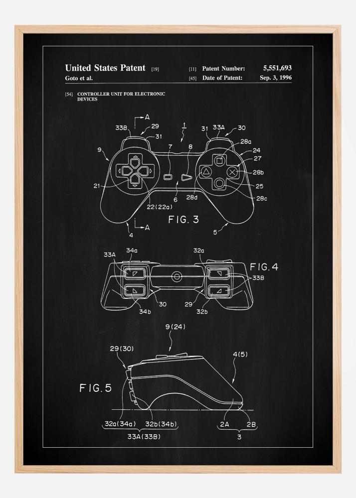 Ez a szabadalmi poszter részletes rajzot mutat be egy Playstation játékvezérlőről, szabadalmi szám: 5,551,693, keltezve 1996. szeptember 3-án, lenyűgöző fekete táblás háttéren. Minden gomb és joystick gondosan van ábrázolva, hogy bemutassa a vezérlő ergonómikus kialakítását és felhasználóközpontú funkcióit. Ez az úttörő koncepció jelentős hatást gyakorolt a későbbi játékvezérlők tervezésére, és hozzájárult a játékélmény formálásához, ahogyan ma ismerjük.