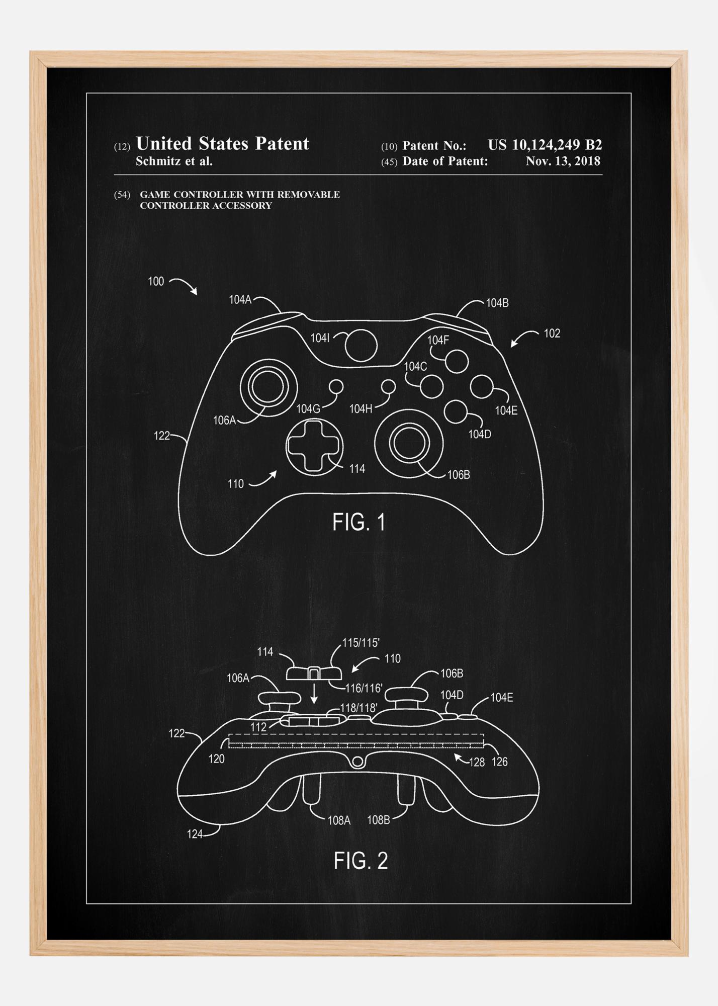 Ez a szabadalmi poszter fekete táblás háttérrel elegánsan kiemeli a modern Xbox játékkontrollert levehető tartozékkal, az US 10,124,249 B2 szabadalmi számmal, amelyet 2018. november 13-án kelteztek. A fejlett dizájn és komponensei részletesen szemléltetve vannak, betekintést nyújtva abba, hogy a technológia és a játéktapasztalat hogyan alakítható a felhasználó számára. Ez a játékkontroller világában zajló folyamatos innováció megnyilvánulása.
