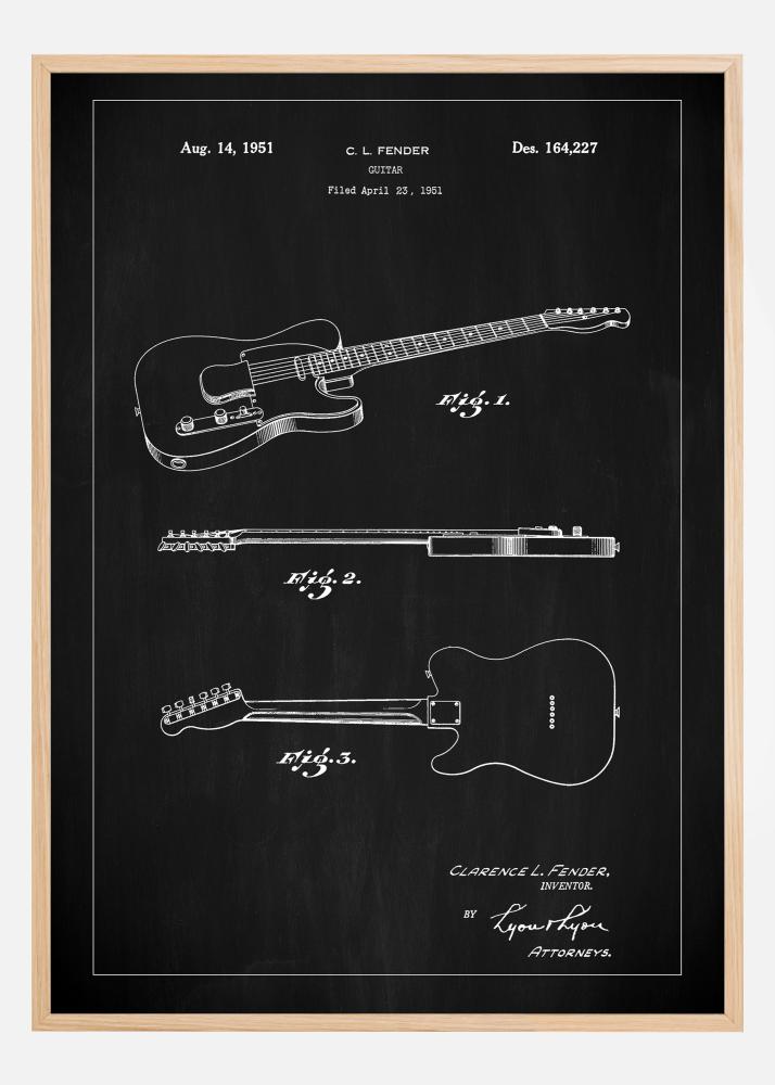 Ez a szabadalomposzter fekete tábla háttérrel erős vizuális hatást kelt, tökéletesen kiemelve Clarence L. Fenders elektromos gitárjának tervezését, a 164,227 szabadalomszámmal, 1951. augusztus 14-től. A gitár ikonikus körvonalai és részletei élesen kirajzolódnak a háttér előtt, tiszta és jellegzetes ábrázolást adva a hangszerről három különböző perspektívából.