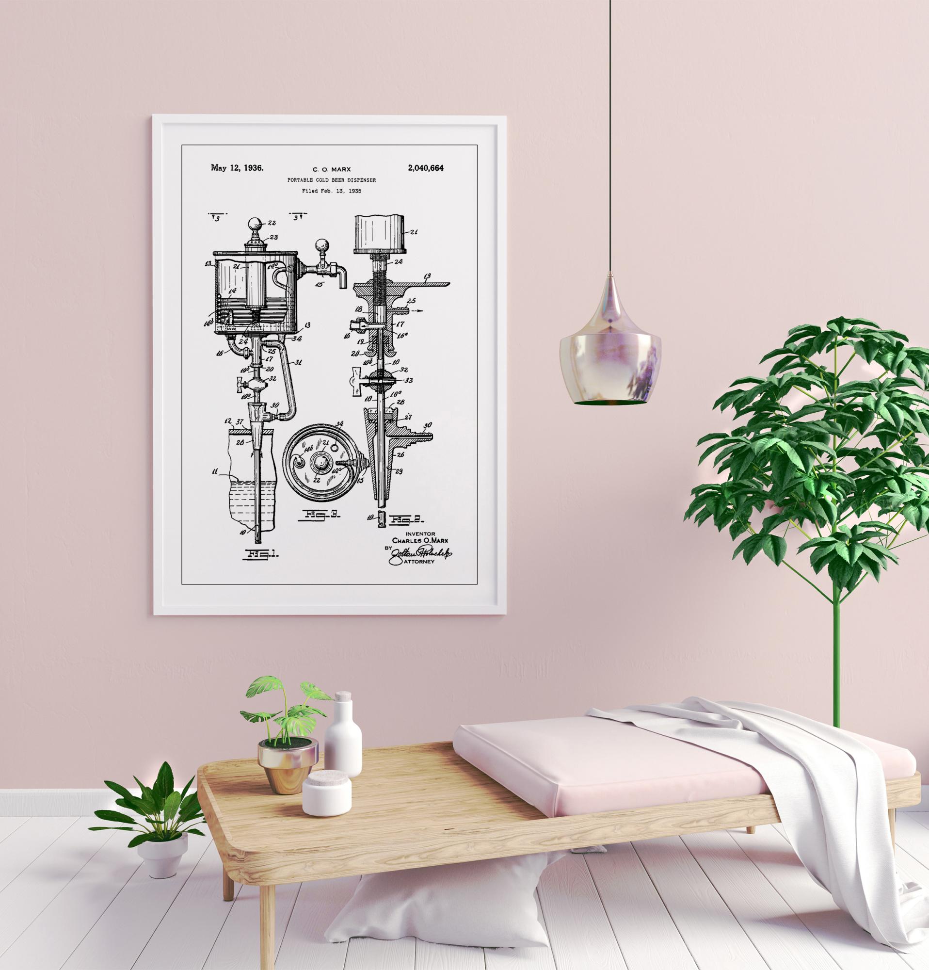 Ez a művészi szabadalmi poszter egy hordozható hideg söradagoló részletes tervét ábrázolja, amelyet Charles O. Marx szabadalmaztatott 1936. május 12-én. A 2,040,664 szabadalmi szám büszkén jelenik meg a gondosan skiccelt készülék fölött, ahol minden vonal és részlet életre kelti az ipari korszak egyedi alkotását. Az elegáns fekete-fehér kontraszt időtlen dekorációs elemmé teszi ezt a szabadalmi rajzot, amely tökéletesen illeszkedik mind egy kifinomult társalgóba, mind egy rajongó gyűjtőhelyiségébe.