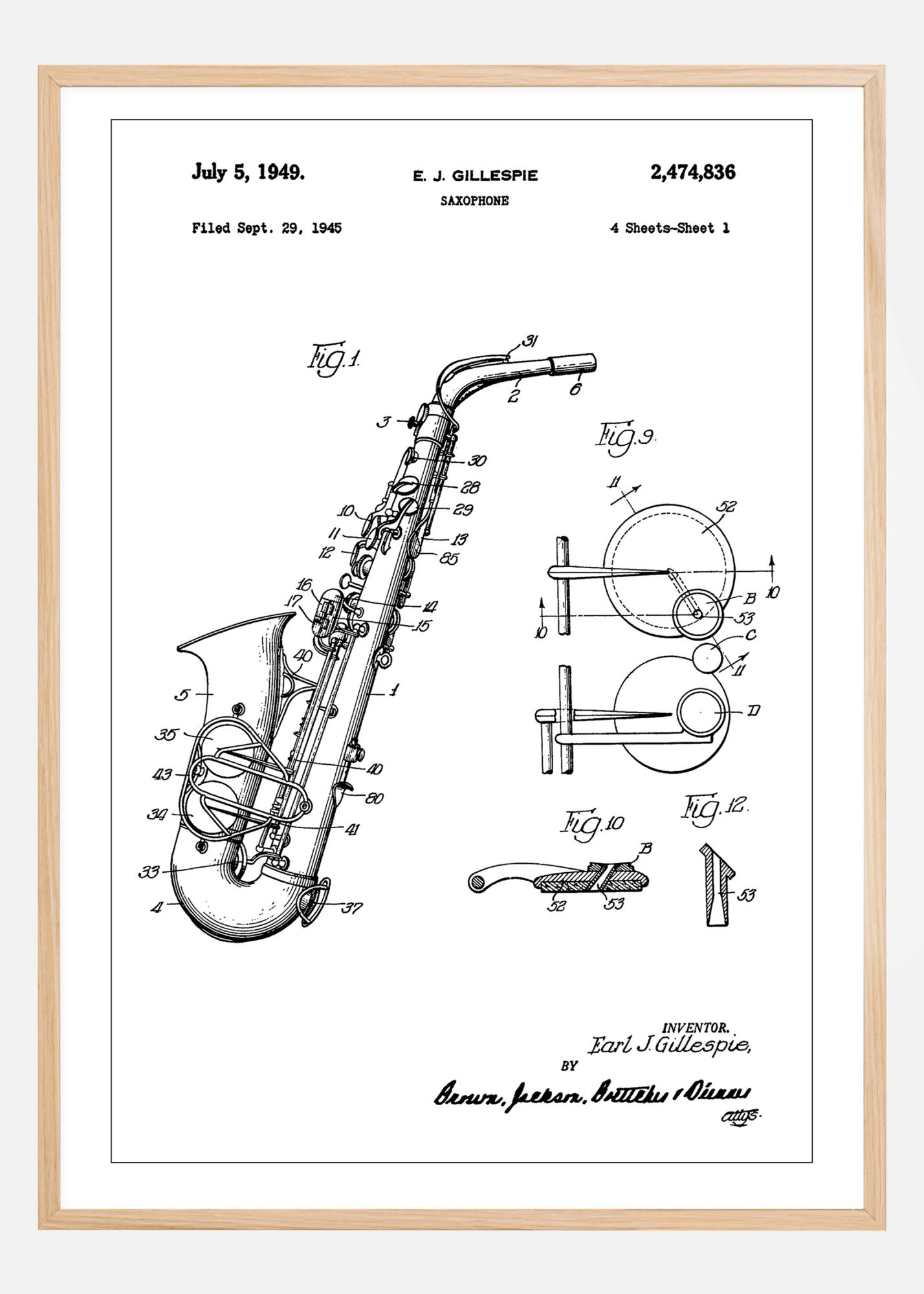 Ez a részletesen kidolgozott szabadalmi poszter egy szaxofon szabadalmi rajzát mutatja be, keltezve 1949. július 5-én. Kiemelkedő példa a hangszerek technikai konstrukciójára és tervezésére, amelyet a szabadalom tiszta vonalai és precíz jelölései emelnek ki. A zene szerelmeseinek, hangszerkészítőknek és ritka diagramok szakértőinek ez a szabadalmi poszter stílusos tisztelgés a szaxofonkészítés kreatív folyamata előtt.