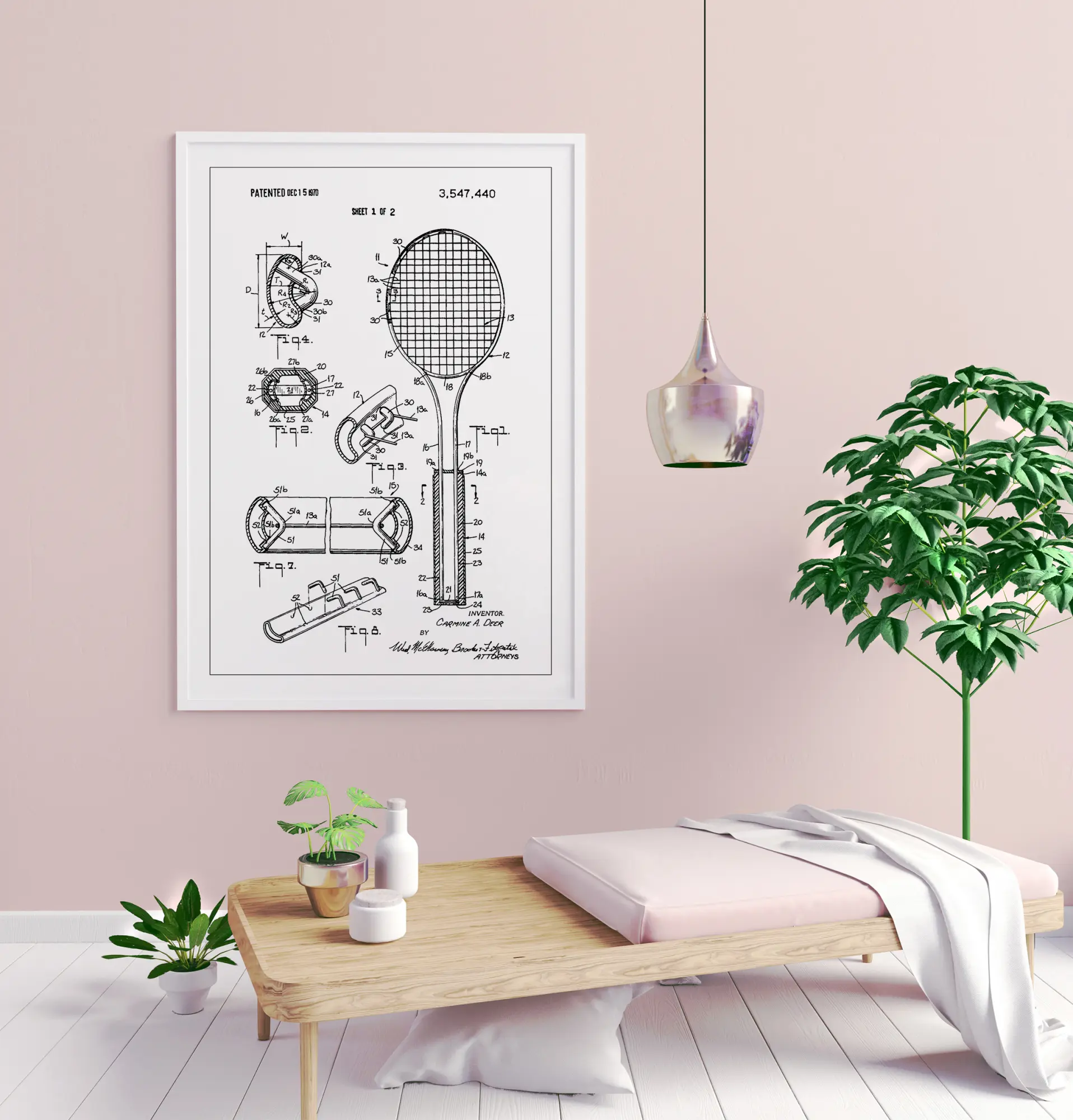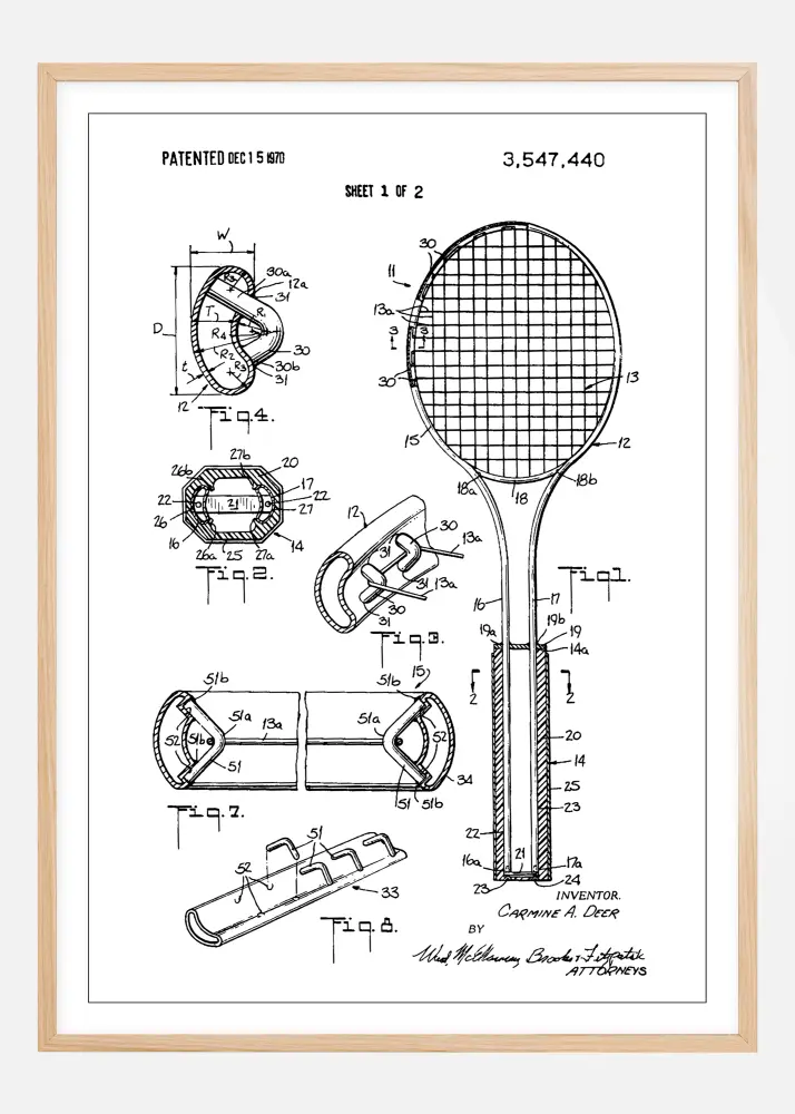 Ez a szabadalmi poszter az Egyesült Államok 3,547,440 számú történelmi szabadalmi műszaki rajzát ábrázolja, amelyet 1970. december 15-én adtak ki, és bemutatja egy teniszütő feltalálását. Pontos vonalaival és az ütő különböző részeinek részletes vázlataival, a markolattól a húrbeállítási mintáig, ez a poszter a mérnöki tudomány és a formaterv valósághű ábrázolása.