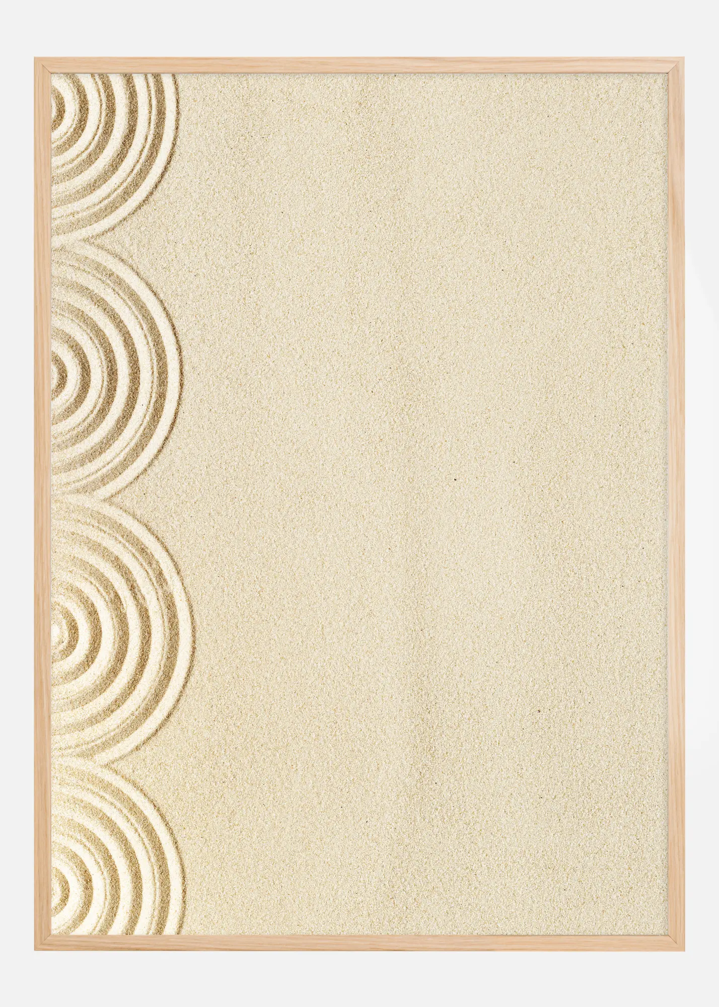 Ez a stílusos és pihentető poszter művészi mintákat ábrázol, amelyeket homokban hoztak létre, így létrehozva a zen és a nyugalom érzését. A lágy homokszínű háttér szinte meditatív ürességet kölcsönöz, míg a bal oldali minták organikus, seprő vonalaikkal és koncentrikus köralakjaikkal vonzzák a tekintetet. Ez a minimalista műalkotás a természet egyszerű szépségeinek és azoknak az finom műalkotásoknak tiszteleg, amelyeket csupán néhány ecsetvonással vagy ujjakkal lehet létrehozni.