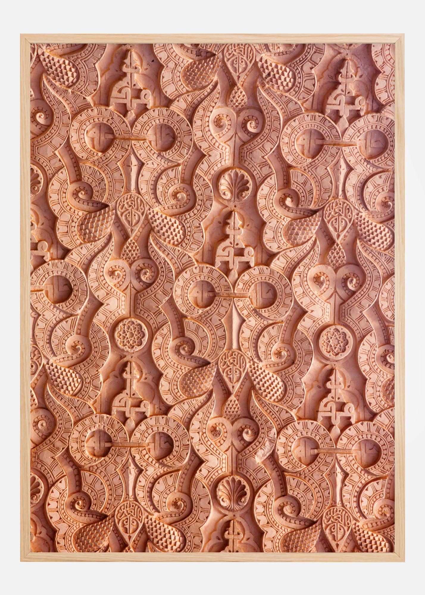 A motívum színei meleg terrakotta és agyag palettán belül maradnak, amely természetes és rusztikus érzést kölcsönöz a képnek. A részletes minta jól kirajzolódik az egységes háttéren, és olyan háromdimenziós illúziót teremt, amely vonzó és mély. Ez a poszter tökéletes annak, aki értékeli a művészetet, amely megragadja a tekintetet és közelebbi vizsgálatra invitálja, valamint értékeli a kézművességet és a hagyományt a lakberendezési stílusában.