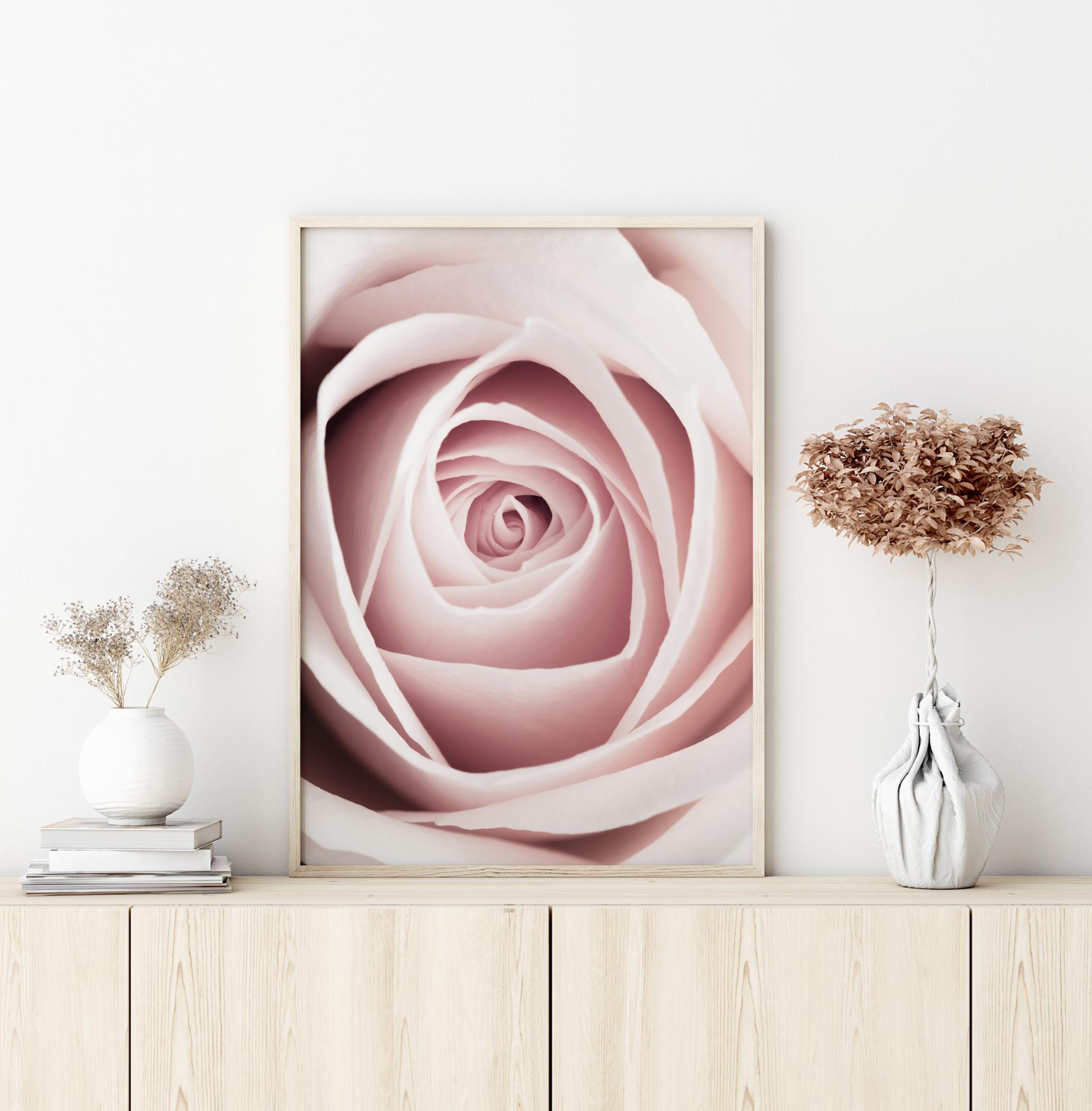Egy lélegzetelállítóan szép nyomat egy kis rózsaszín rózsabimbóról. A rózsa szép, lágy tónusai melegséget és mélységet sugároznak. Akaszd ezt az érzékeny posztert a hálószobád falára, és vidd be otthonodba ennek a virágnak a szépségét.