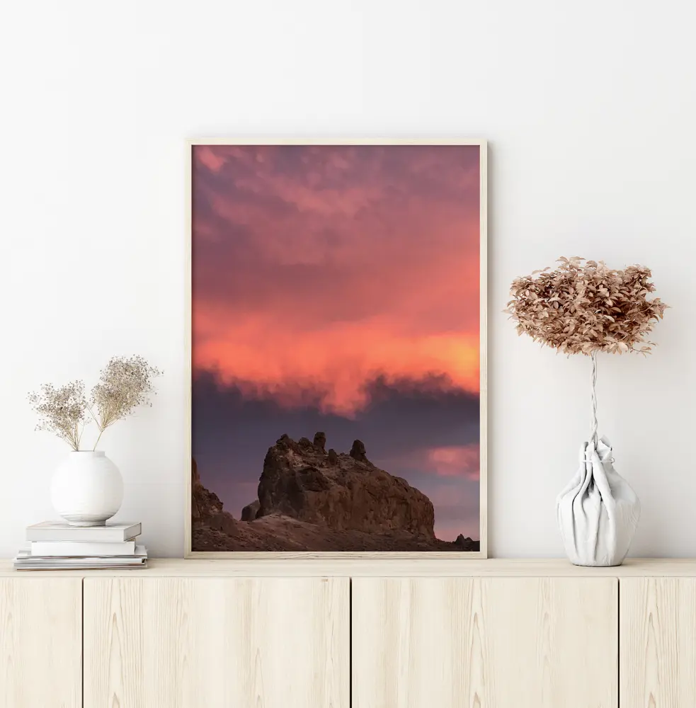 Egy lélegzetelállítóan szép nyomat egy sziklás hegycsúcsról. A lenyűgöző rózsaszín égbolt a narancssárga esti sugarakkal gyönyörűen megvilágítja a sötét sziklákat. Érezd a levegő melegét és csendjét, amikor ezt a posztert a nappalidban felakasztod.