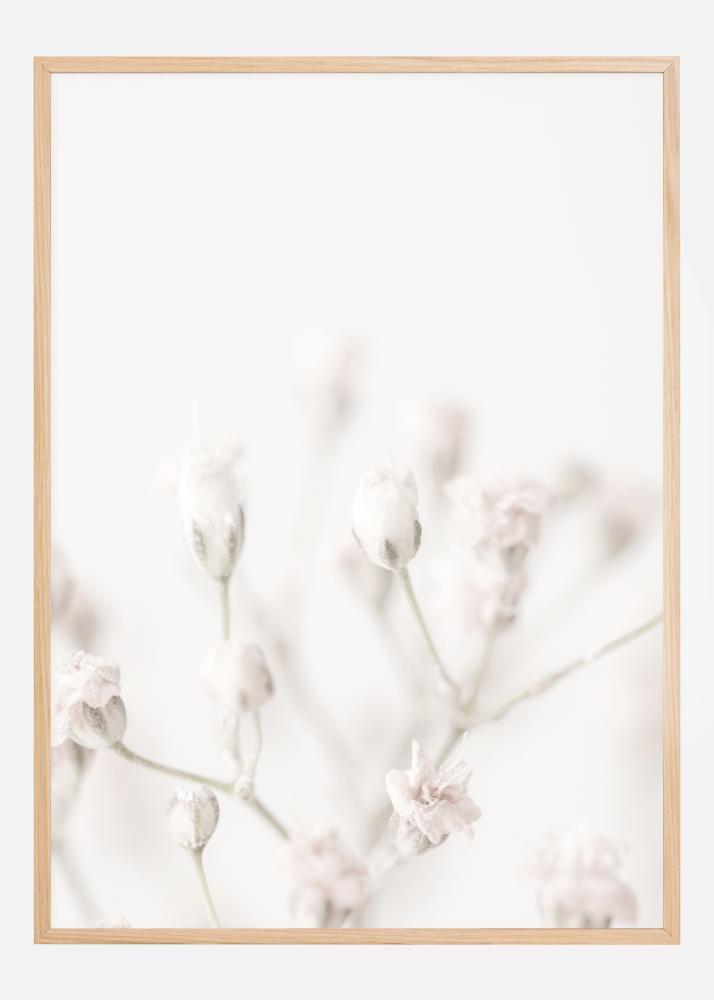 Varázslatos közeli kép plakát kis rózsaszín virágokkal, amelyek erősen ellenállnak a fehér hóesésnek. A homályos fehér háttér előtt a virágok csak gyengén láthatók puha rózsaszín szirmaiknak köszönhetően. Hozd be otthonodba a téli tájat ezzel a lenyűgöző nyomtatvánnyal.
