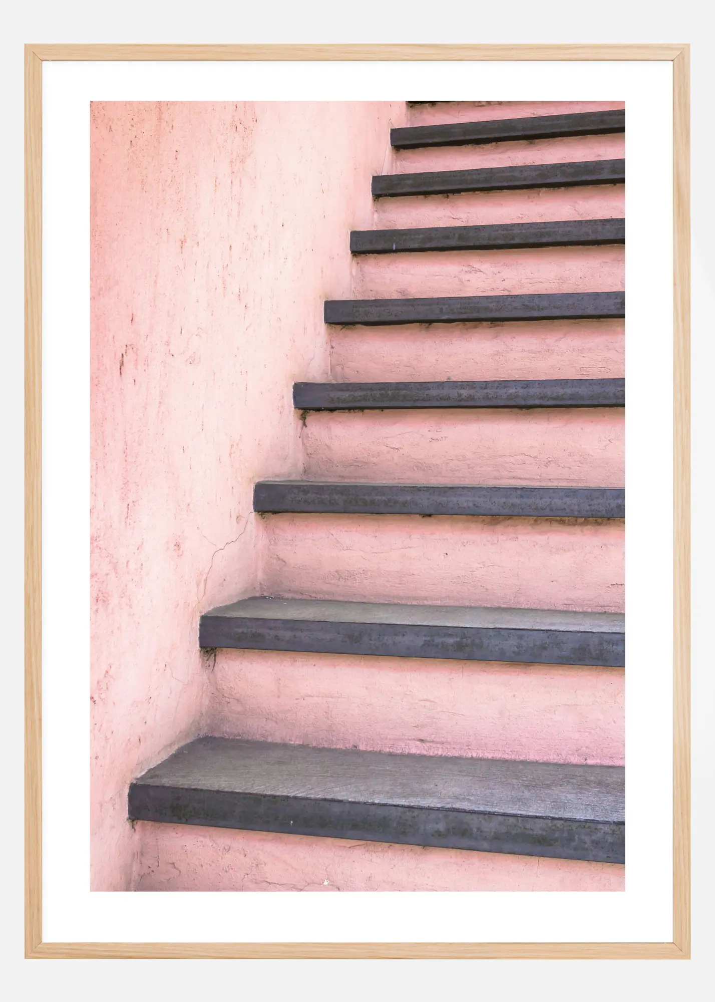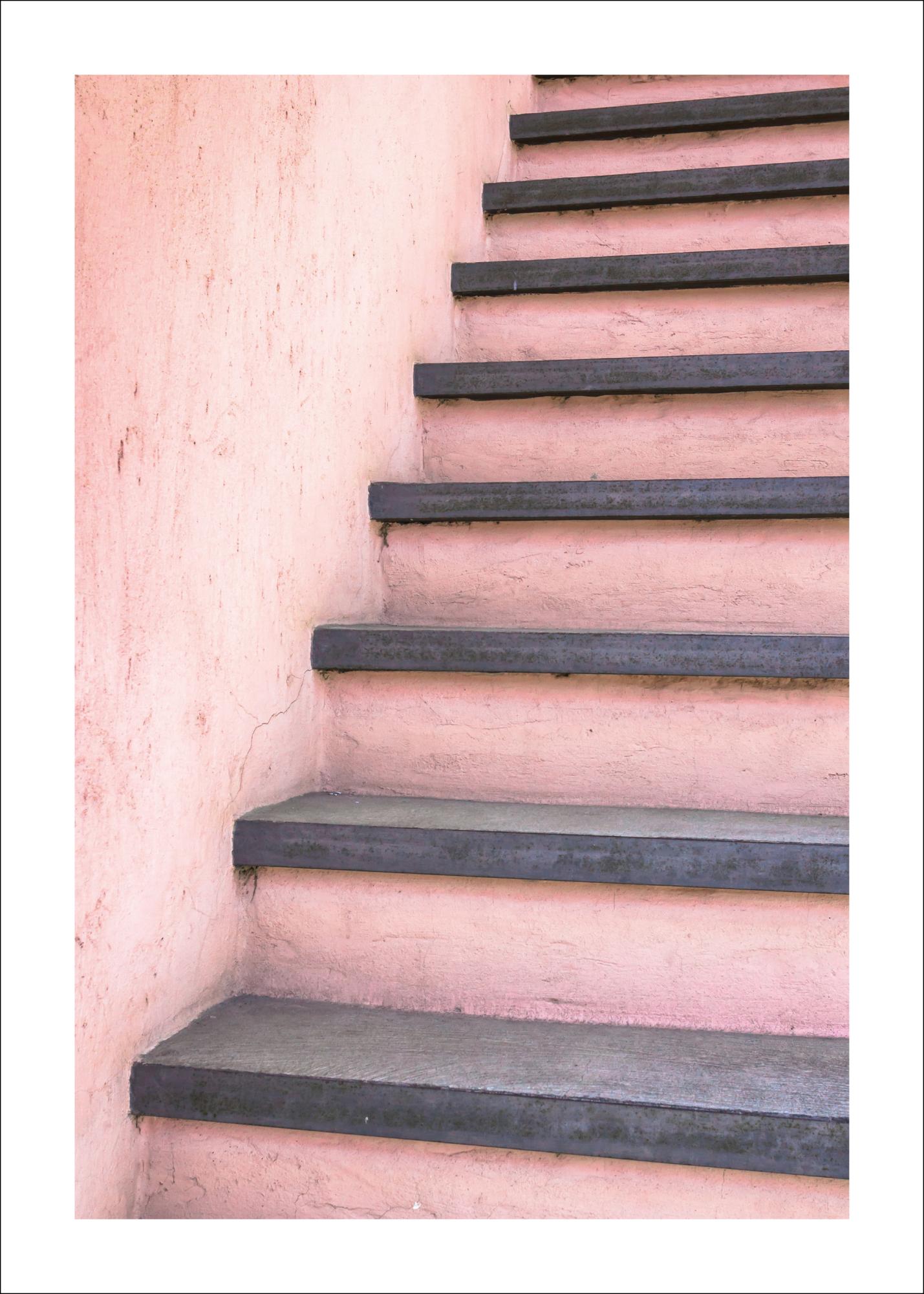 Egy fénykép a lépcsőről, amelyen rózsaszín pasztell és szürke beton gyönyörű kontrasztja látható. Egy egyszerű és letisztult poszter, tökéletesen kombinálható más kedvencekkel egy nagyobb képkeret falán. A legtöbb otthonba és berendezési stílushoz illik.