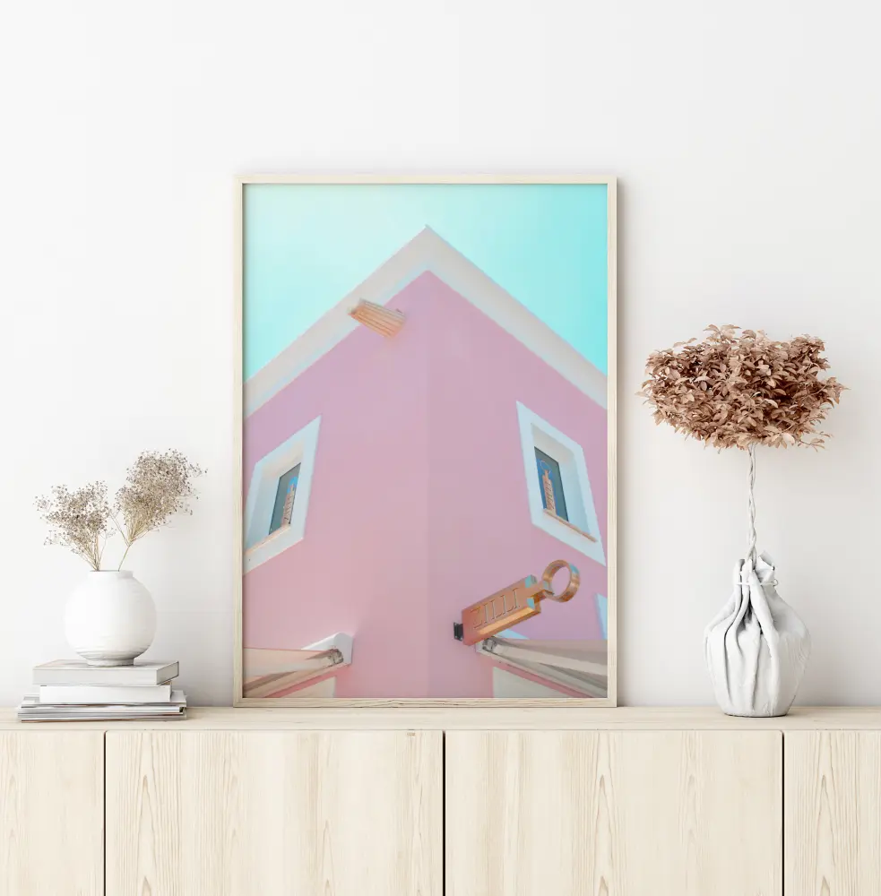 Egy szupertrendi épület, amelyet fehér ablakkeretek szegélyeznek. A világoskék ég gyönyörűen kiemeli a világos rózsaszín boltot. Az épület sarkán egy arany boltjelző tábla lóg Zilli névvel, míg két napellenző van kihúzva, hogy árnyékot biztosítson. Akassza fel ezt a posztert egy fehér falra, és elevenítse fel a szobát.