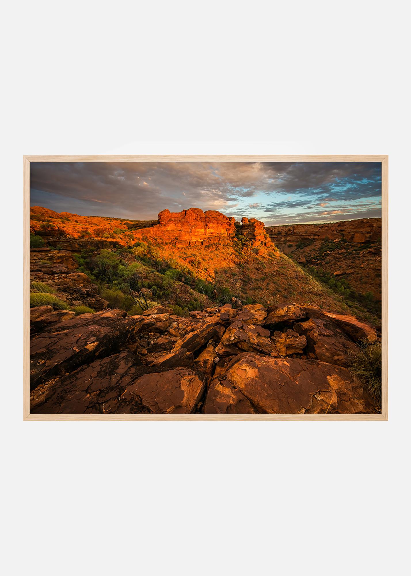 Poszter fényképpel a vad vörös hegyekről naplementében, valami azoknak, akik szeretik a sivatagokat és a sziklaformációkat, hogy a falra akasszanak. A meleg vörös tónusok a jeges kék ég felé és a kép mélysége érdekes motívumot hoznak létre. Keretezd be a posztert egy csinos képkerettel, és rakd fel egy képfalra más sivatagi motívumokkal együtt.