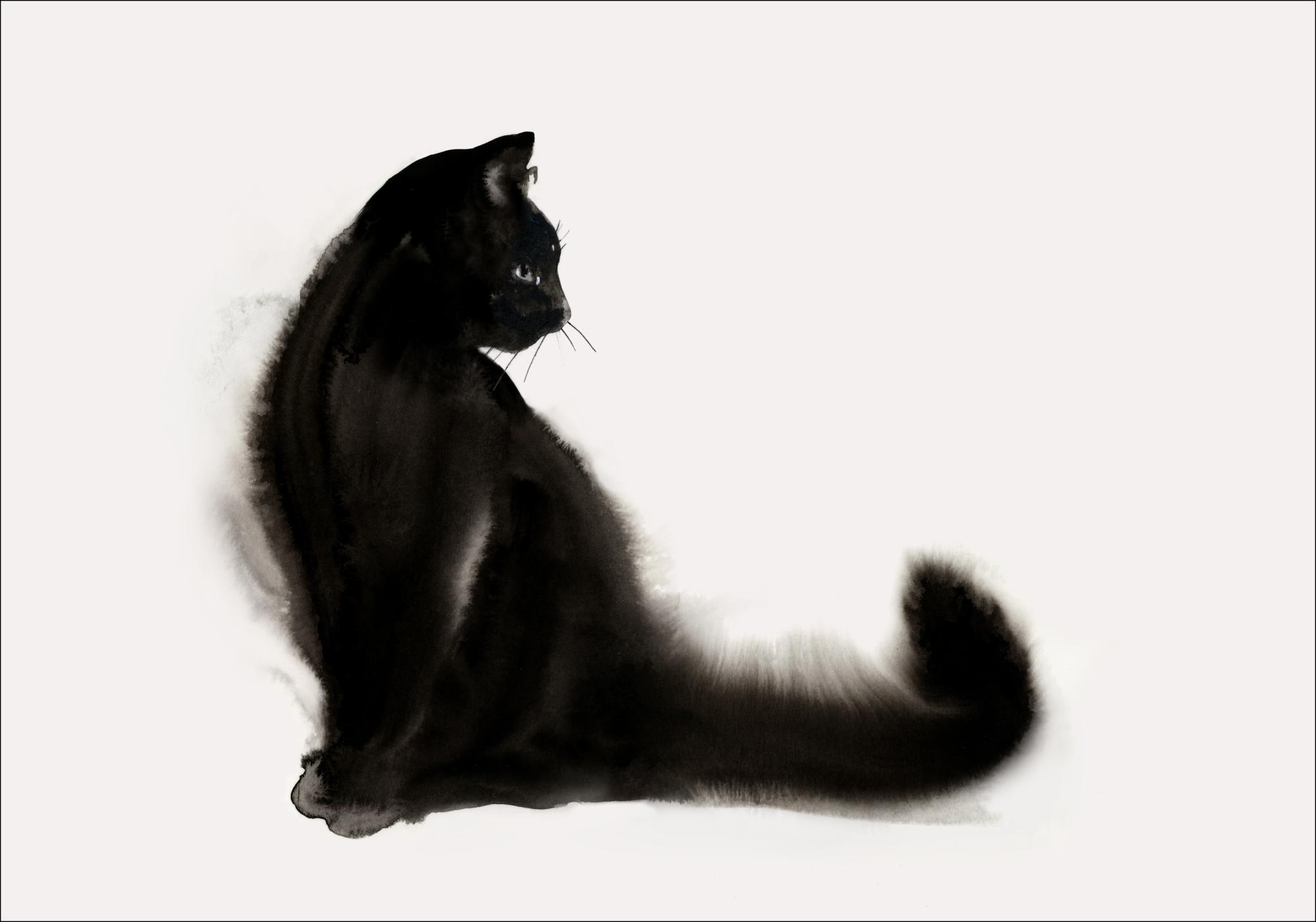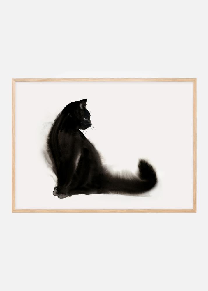 Egy gyönyörű nyomat egy fekete burmai macskáról. Fehér háttér előtt a fekete macska a válla fölött hátranéz, mintha megfigyelne valamit. A természetes fény megvilágítja a macska mellső lábát és fehér foltot hoz létre. Egy fantasztikus poszter macskarajongóknak.