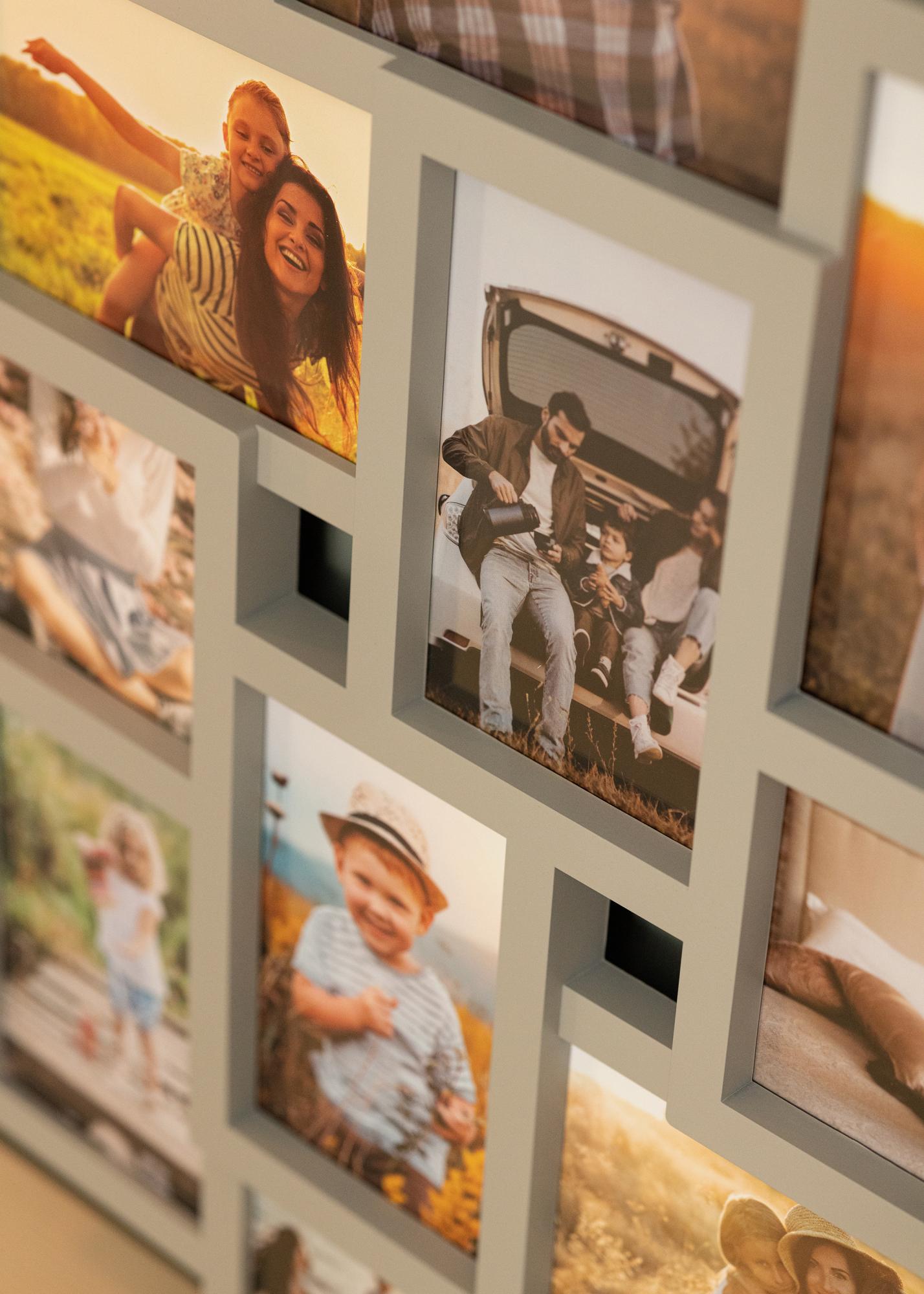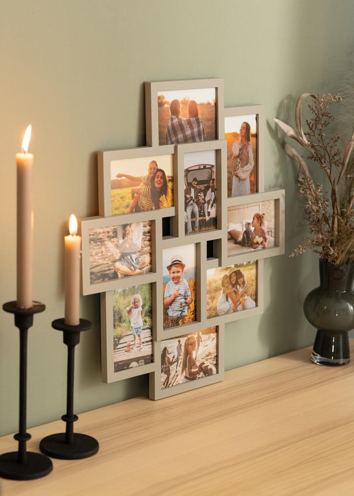Ez egy kollázskeretes képkeret, amely 10 darab 10x15 cm-es képet tud befogadni. A keret álló és fekvő képformátumú fotókat kever, ami nagyon dinamikus megjelenést eredményez. A kifinomult szürke szín feldobja a képeid árnyalatait, és lehetővé teszi, hogy a témák kerüljenek a középpontba. A motívumokat a hátlap meglazításával szerelheted be a keretbe, amelyet kis forgatható csipeszek tartanak a helyén. Minden fotót egyetlen hátlap tart a helyén, így egyszerűen behelyezheted az összes képet a keretbe egyszerre.