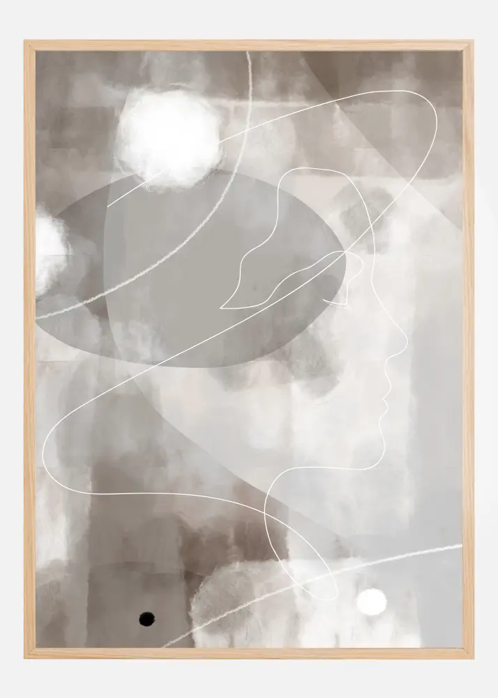 Egy műalkotás, amely egy kalapot viselő nőt ábrázol. Ez a gyönyörű profilnyomat ügyesen lett megrajzolva anélkül, hogy valaha is felemelték volna az ecsetet a nyomatról. A nő körvonala világosbarna háttér előtt helyezkedik el, néhány fehér felhővel a nyomat felső részén. Egy gyönyörű poszter egy női hálószobához.