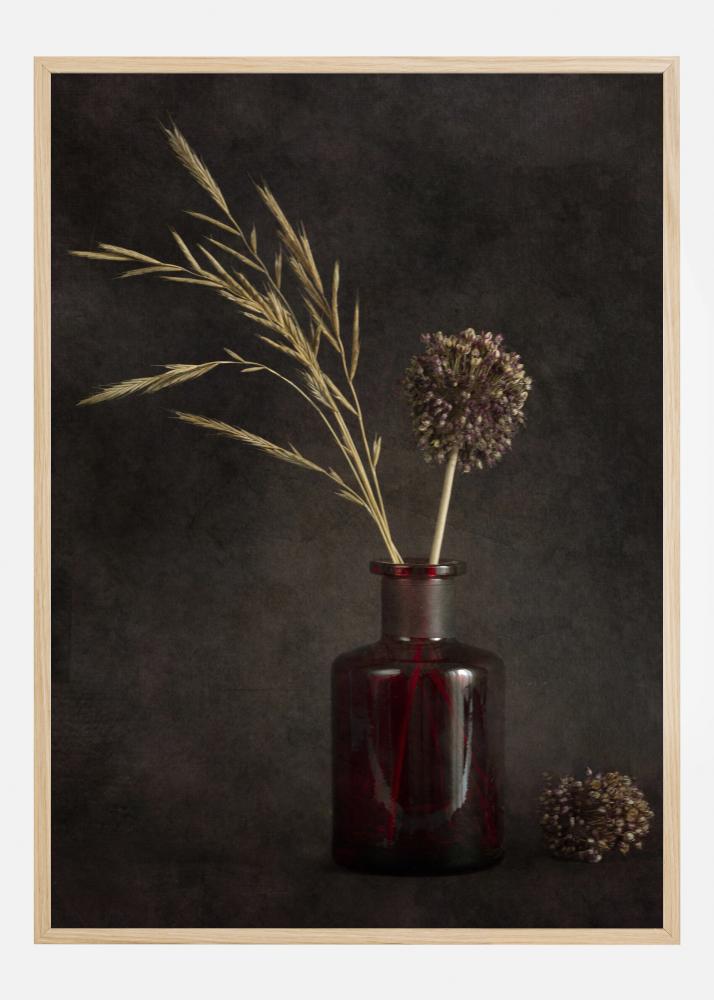 Két szárított fű egyszerű, de szép nyomata üvegedényben. Sötétbarna háttér előtt a sárgás színű füvek piros színű edényben vannak elhelyezve. A váza jobb oldalán egy további szárított fű található. Egy gyönyörű poszter, amely egy kis színt visz a fehér falra.