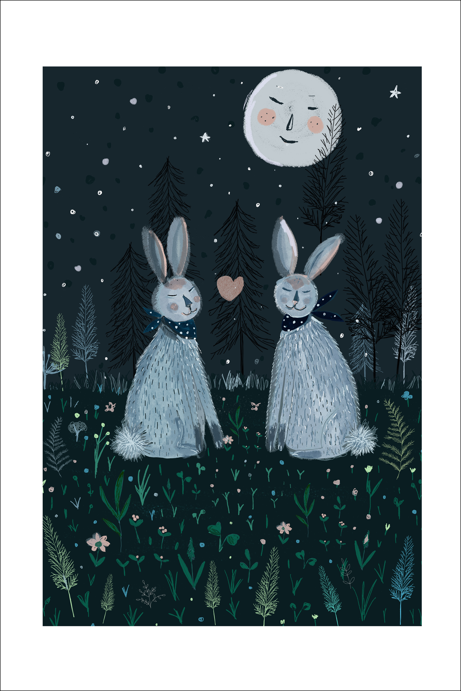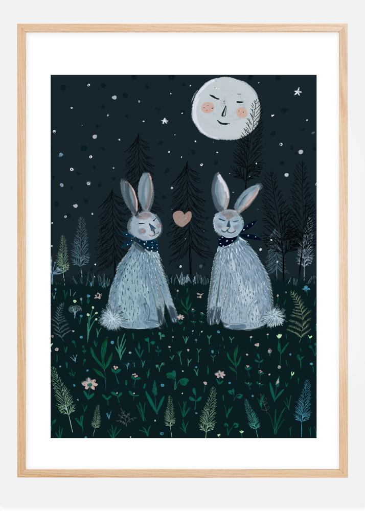 Egy vidám poszter a holddal és az erdei nyulakkal, akik békésen alszanak. A csillagok fényesen ragyognak, míg a talajnövényzet körülveszi őket a hűvös esti hangulatban. A nyulak nyaka köré kötött kendőkkel és egy szívvel, amely közöttük helyezkedik el, ez a poszter tökéletes minden szerelmes számára.