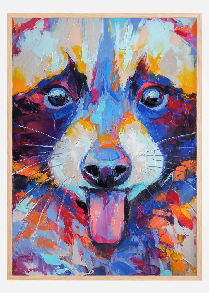 Egy többszínű portréposzter egy mosómedvéről. A jól elosztott színek tökéletes képet adnak az égszínkék szemeiről, sötét orráról, rózsaszín nyelvéről és fekete-fehér bajuszáról. A művész aláírásával az alján balra szereplő közeli kép leginkább egy állatrajongó nappalijába vagy hálószobájába illik.