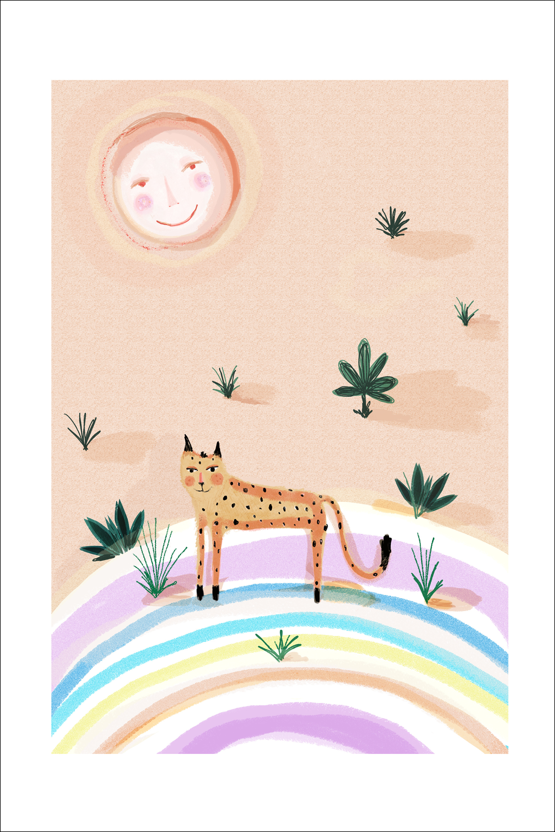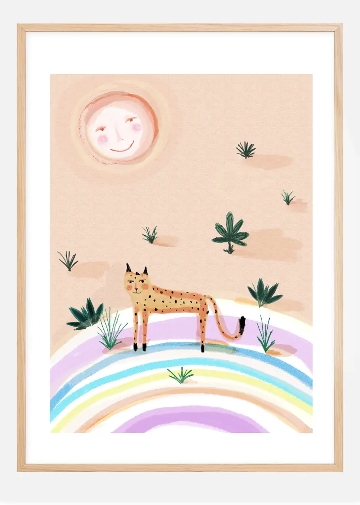 Egy vidám sivatagi poszter, amelyen egy leopárd és egy nap látható, mindkettő mosolyog. Egy sokszínű felületen elhelyezett kis, vékony leopárdot körülveszik kis sivatagi növények. Ideális nyomat, amelyet a gyermeke hálószobájába akaszthat, hogy vidám hangulatot teremtsen.