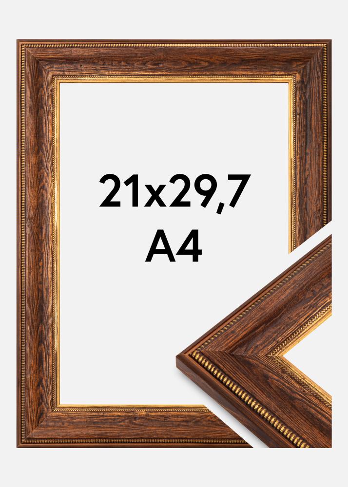 Ez az elegáns képkeret 21x29,7 cm-es méretben a rusztikus báj és a klasszikus elegancia tökéletes kombinációja. Kiváló minőségű fából készült, a keret mélybarna színű, díszes arany részletekkel a belső szélén. A fa struktúrája jól látható és meghitt, természetes érzetet ad, míg az aranyszínű elemek kifinomult érintést adnak hozzá, ami kitűnően illik a hagyományos és vintage ihletésű berendezésekhez.