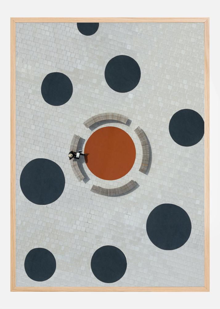 Ez a konceptuális poszter egy olvasó személy jellegzetes, madártávlatú képét ragadja meg, amelyet szimmetrikus és grafikus kompozíció vesz körül. A fehér, csempézett felület absztrakt dizájnja, amelyet nagy fekete körök és egy központi rozsda vörös kör padokkal törnek meg, erős vizuális kontrasztot ad. Ez a plakát nemcsak a dizájn és az építészet előtt tiszteleg, hanem a mindennapi jelenetek játékos értelmezése is.